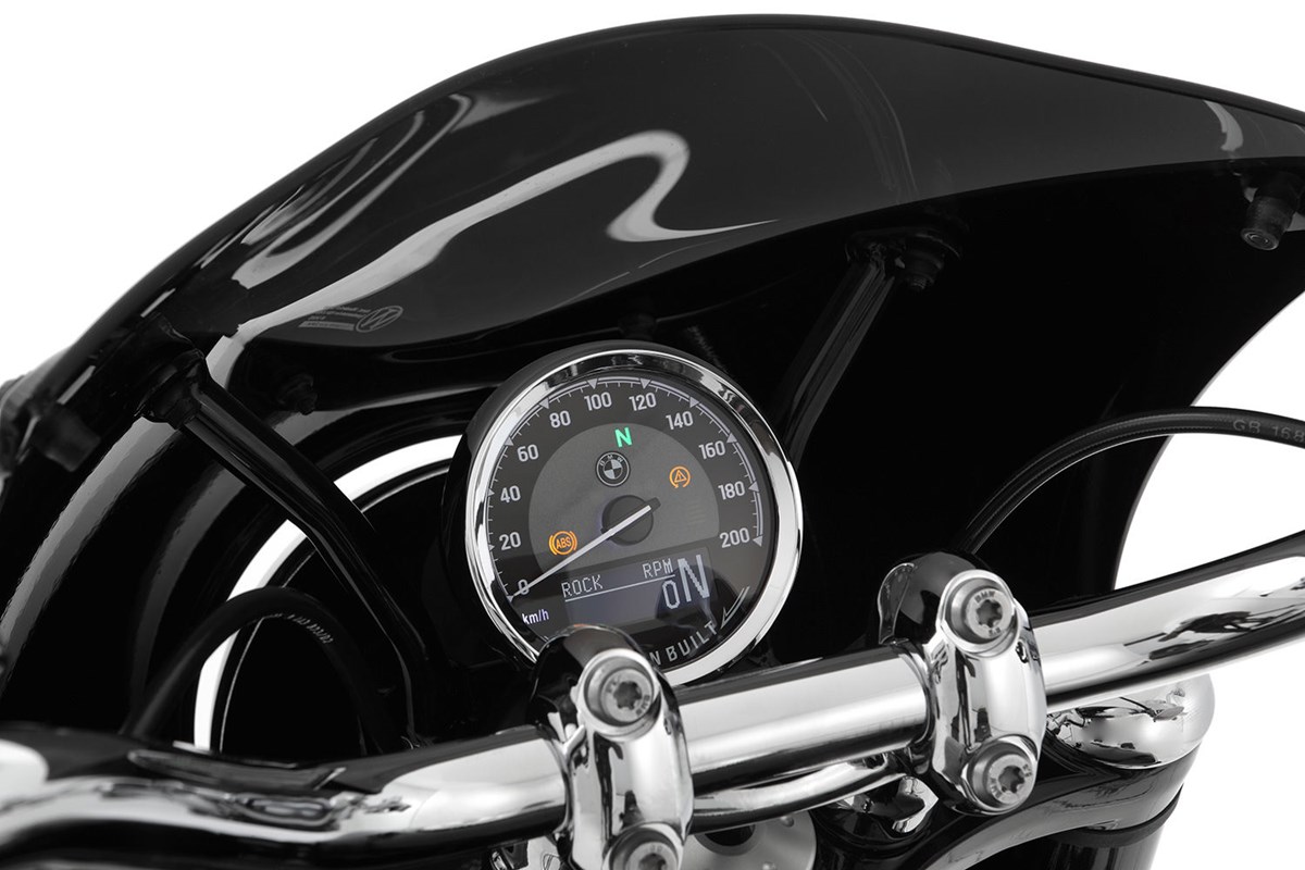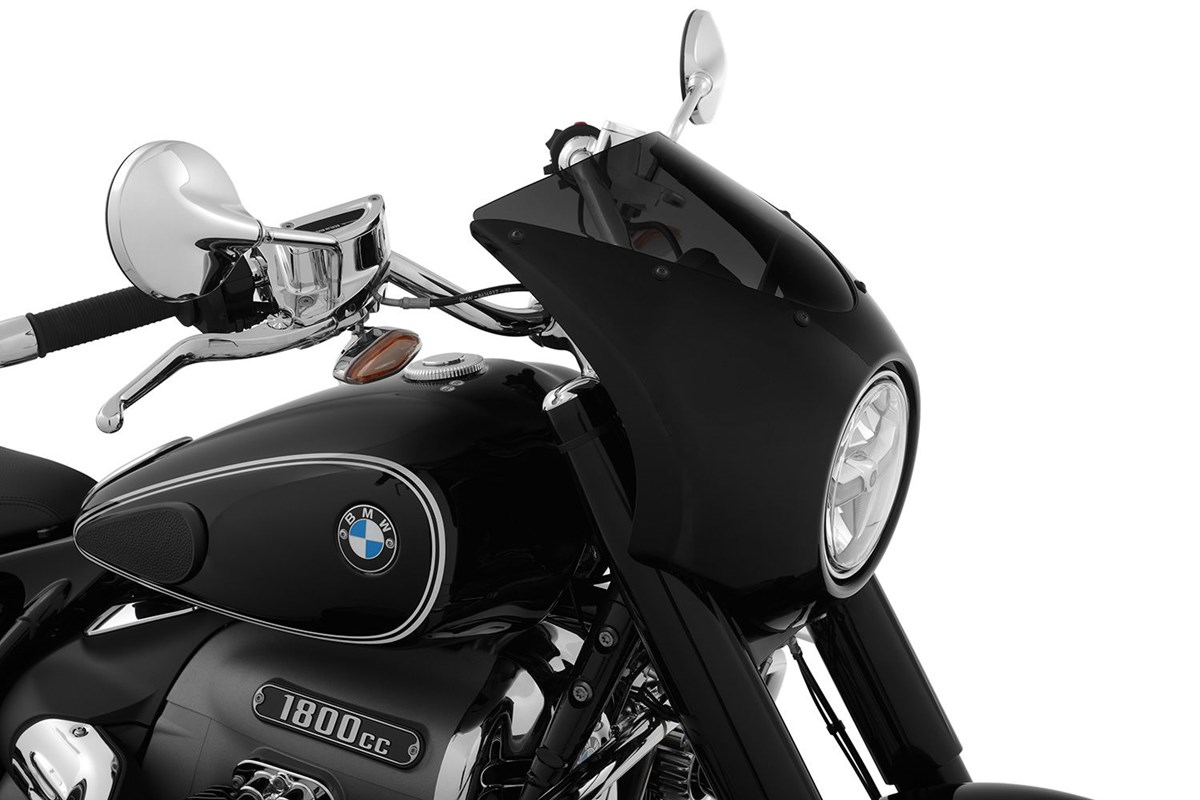 Bei unserer Lampenmaske »Rock ’n‘ Roll« handelt es sich um eine außergewöhnlich gestaltete, lenkerfeste Verkleidung, die auf den ersten Blick einen hohen Wiedererkennungswert besitzt. Sie verbindet auf ausgewogene Weise noble Erscheinung mit Sportlichkeit. Die Noblesse ergibt sich durch das Aufgreifen und Fortführen der weißen Doppellinie der R 18 auf dem passendem, tiefschwarzen (Blackstorm metallic) Untergrund. Die beiden unterschiedlich breiten Linien lassen wir von einem Könner seines Fachs, der die Kunst mit Schlepppinseln umzugehen perfekt beherrscht, von Hand auftragen. Die Lackierung selbst erfolgt ebenfalls von Hand. Die sportliche Note erreichen wir durch die außergewöhnlich schmale, gestreckte und dem Fahrer zugeneigte Form und Gestalt. Das Ganze fügt sich wie selbstverständlich in das hochwertige Design des großen Cruisers ein und setzt gleichwohl einen eigenen Akzent in der Front- und Seitensilhouette des Big Boxers.