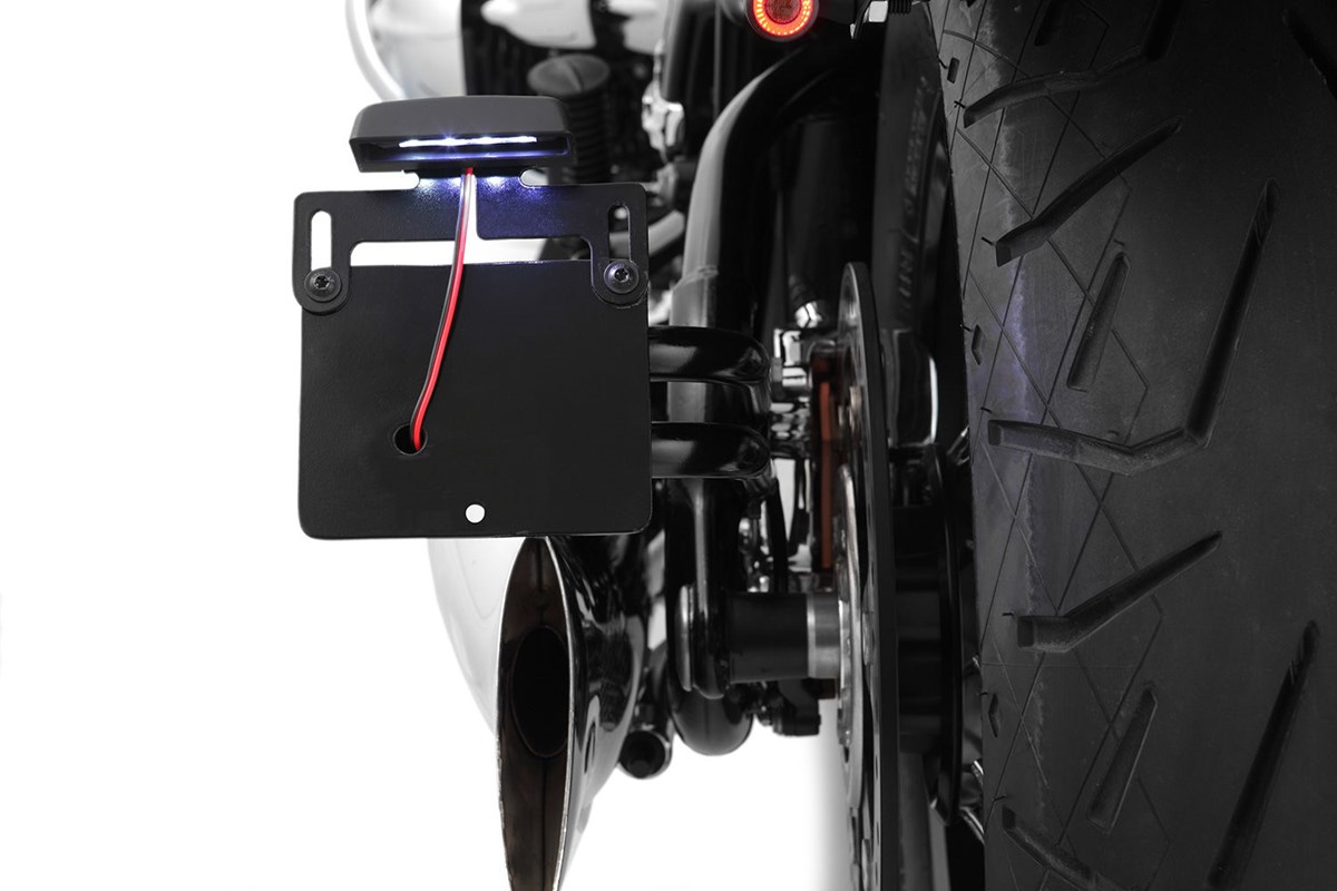 Der edle Wunderlich Kennzeichenträger erlaubt den freien Blick aufs prächtige Hinterrad der BMW R 18. Zudem fügt sich die gekonnt gestaltete Konstruktion hervorragend in die Linie des Cruisers ein. Passend zum edlen Rahmen der R 18 haben wir den Kennzeichenträger in Schwarz glänzend pulverbeschichtet. Die einfache Montage geschieht an vorhandenen Aufnahmepunkten an der Schwinge. Die Kabelführung für die Kennzeichenbeleuchtung erfolgt raffiniert und unsichtbar durch die Rohre des Kennzeichenträgers, die LED-Kennzeichenbeleuchtung im gefrästen Gehäuse, kann wahlweise oben oder seitlich montiert werden.