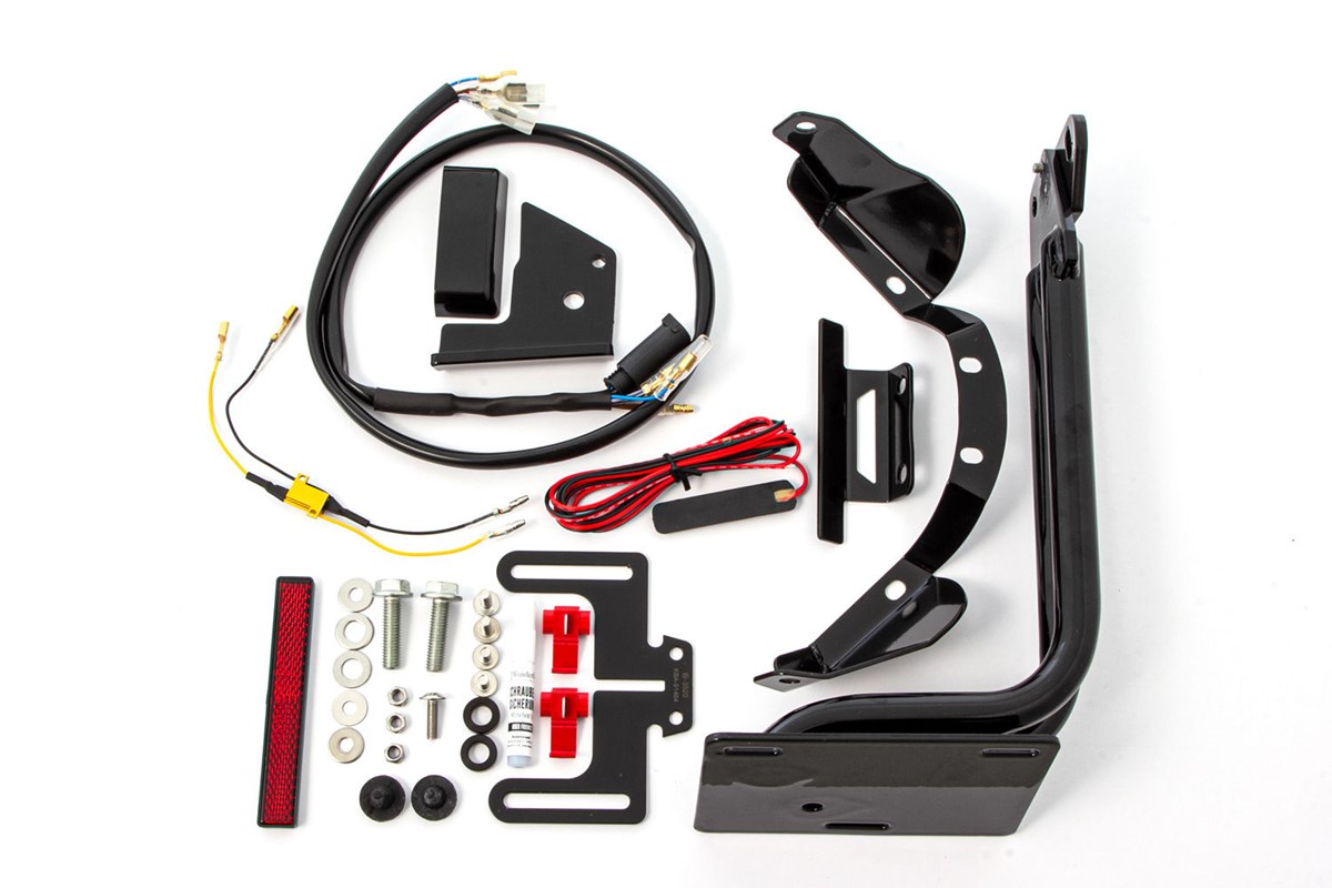 Unser Heckumbau LOW besteht aus dem seitlichen Kennzeichenträger, einem Blinkerhalter zur Aufnahme von Zubehörblinkern mit einem M8 Anschlussgewinde, einem demontierbarem Rückstrahler sowie einem Kabelsatz speziell für diesen Umbau.