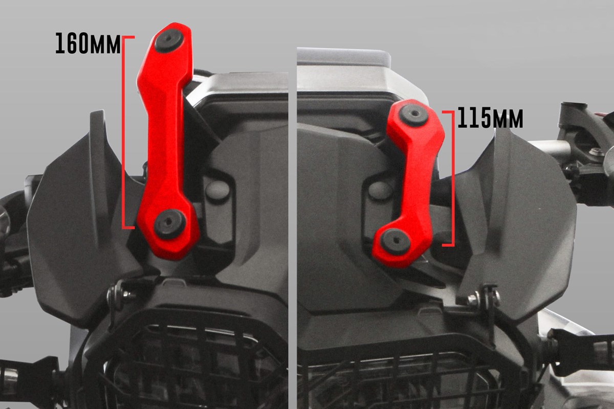 Hinweis: Diese Verkleidungsscheibe ist ausschließlich für Modelle mit der kurzen Scheiben-Halterung geeignet. Die kurze Scheibenhalterung ist die Standard-Scheibenhalterung bei der F 750 GS mit 115 mm Abstand der Schraubenlöcher. Verfügt Ihre F über eine lange Scheibenhalterung mit 160 mm Schraubenabstand (kann beim Fahrzeugkauf der F 750 GS optional bestellt werden), ordern Sie bitte die Verkleidungsscheibe 20230-304.