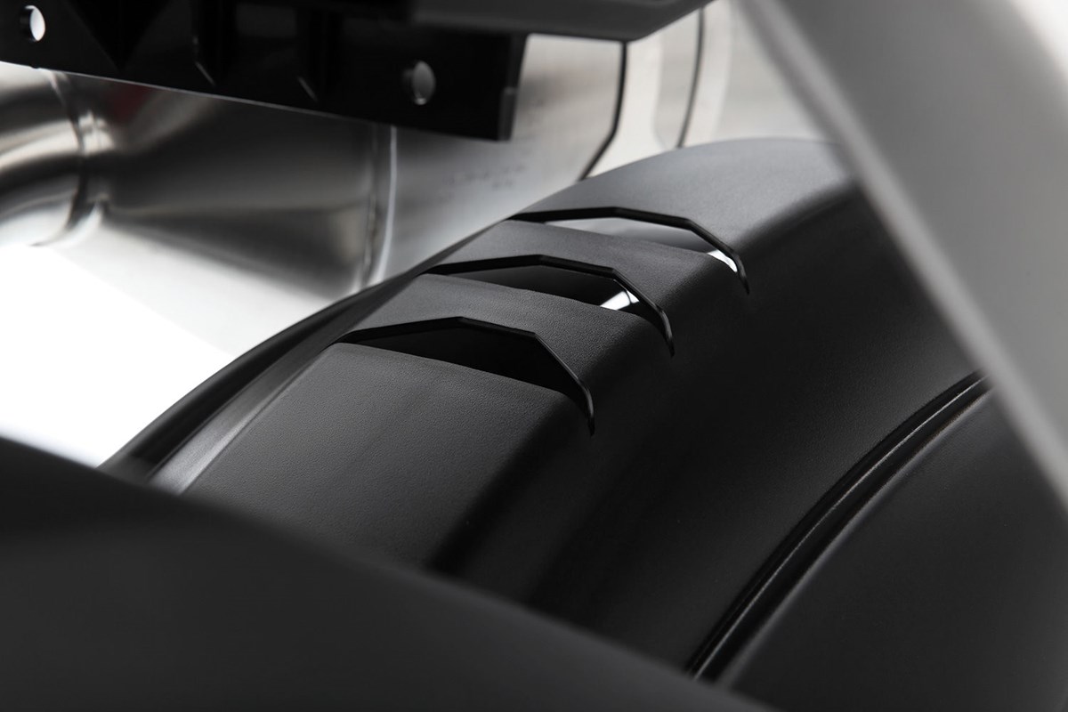 Drei speziell geformte Öffnungen am Umfang der Abdeckung sorgen gleich zweifach für eine effektive Geräuschminimierung: Das Resonanzverhalten der Hinterradabdeckung wird positiv beeinflusst und die aerodynamisch erzeugten Geräusche im engen Spalt zwischen Rad und Abdeckung werden strömungsakustisch reduziert.
