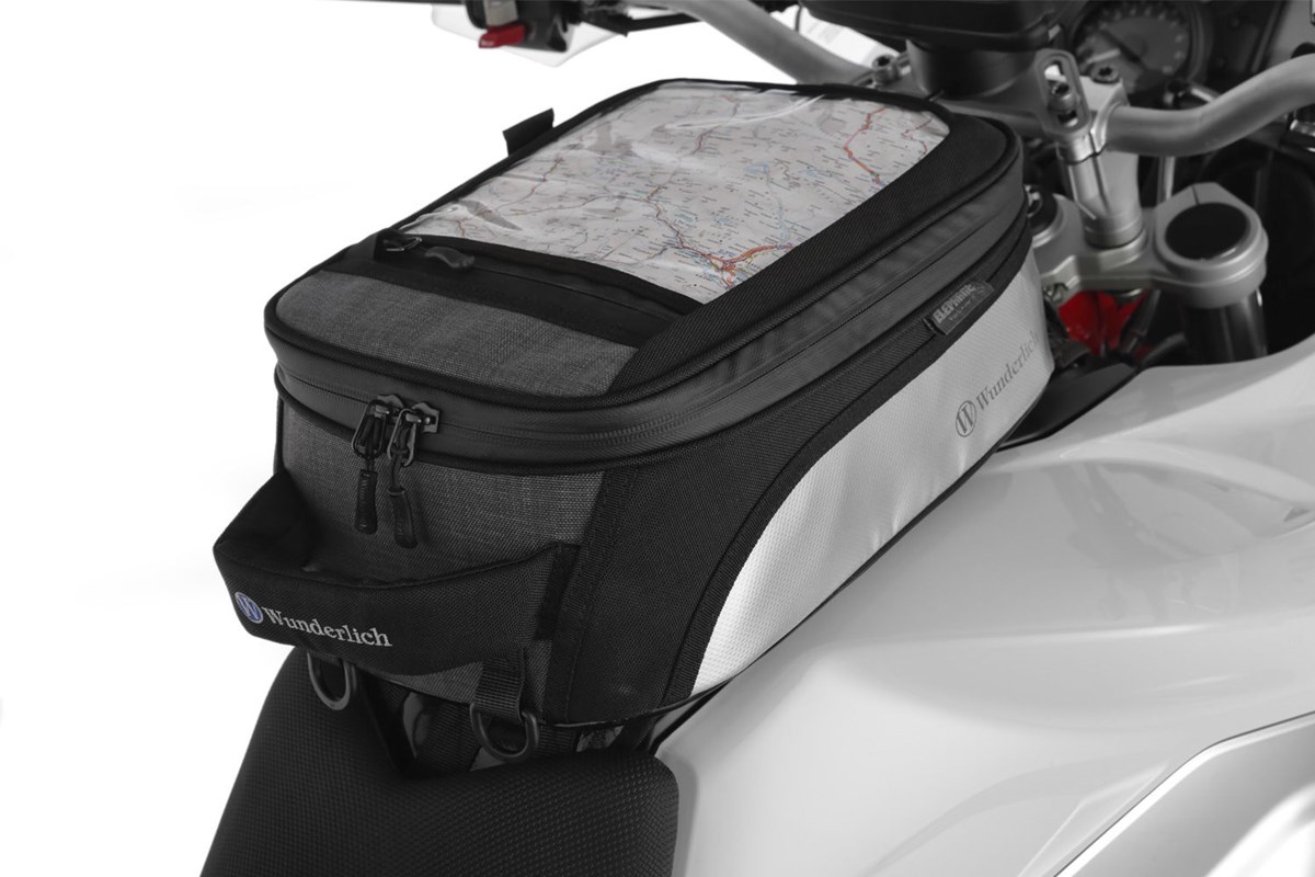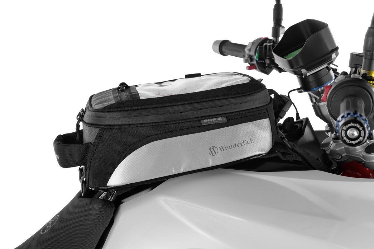 Zum Betanken mit einem Handgriff abklappbar. Die Systemhalterung ist schnell abnehmbar, kann aber auch am Fahrzeug verbleiben und schützt so den Lack. Zudem ist die Halterung auch zur Aufnahme des separat erhältlichen Kartenfachs ohne Verwendung des Tankrucksacks geeignet.