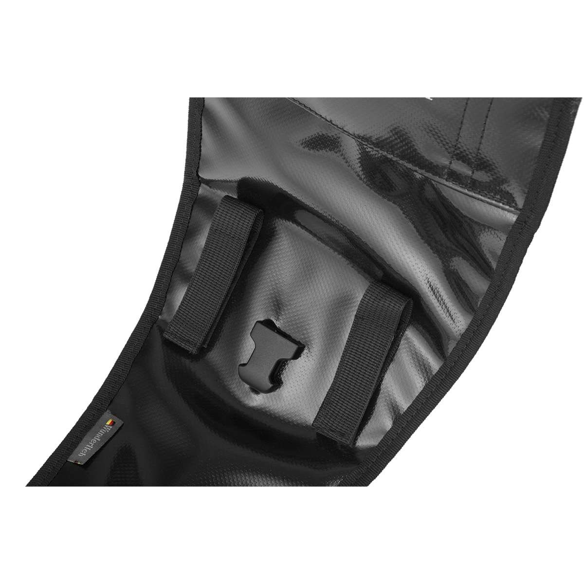 Die Systemhalterung wird mit wenigen Handgriffen am Fahrzeug befestigt und nimmt den Tankrucksack per Schnellbefestigung auf. Einfach die Haltezunge des Tankrucksacks durch die Aufnahme an der Halterung schieben und vorne verschließen. Eine einfache und deshalb geniale Schnellbefestigung, die auch mit Handschuhen und klammen Fingern ein sekundenschnelles An- und Abbauen ermöglicht.