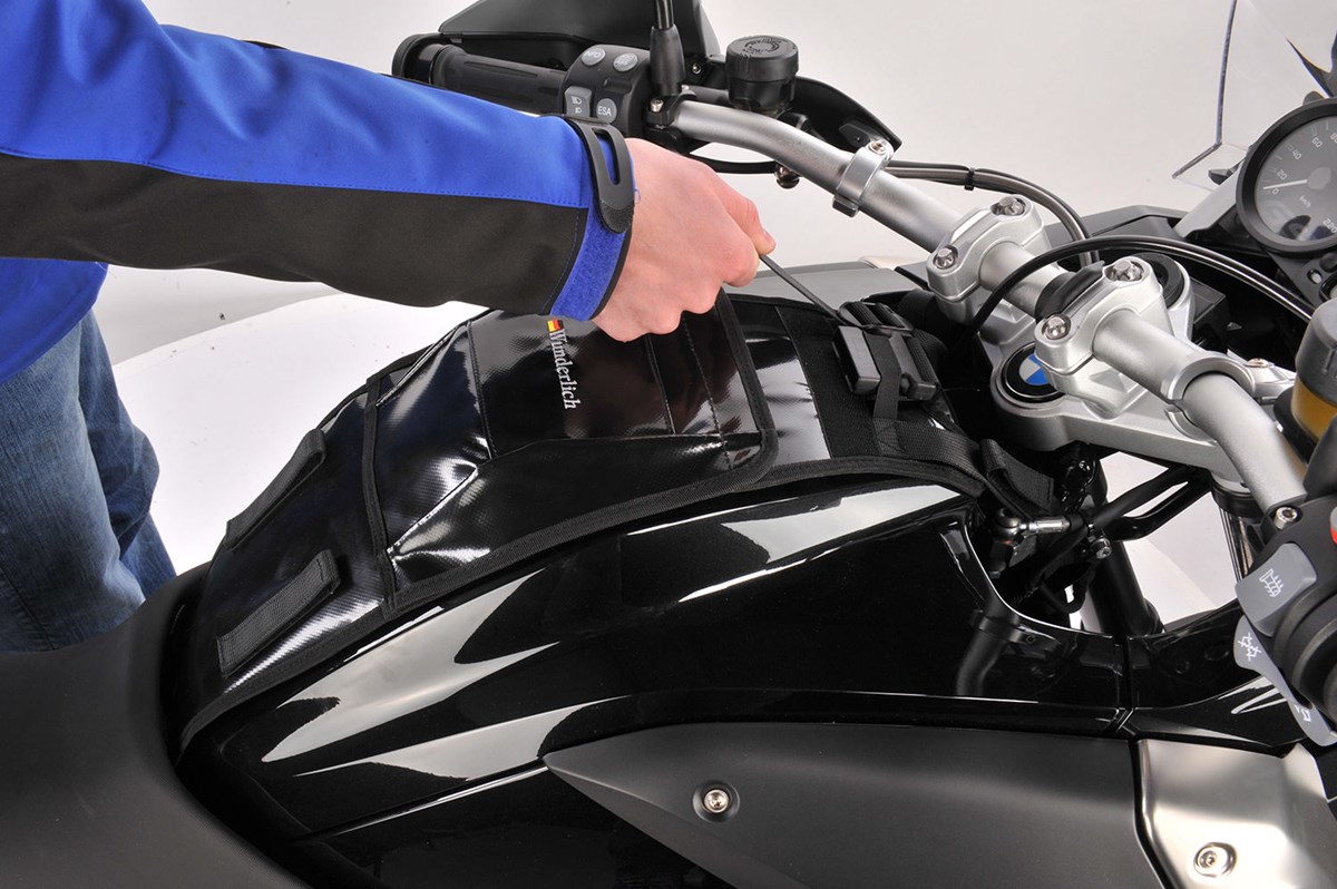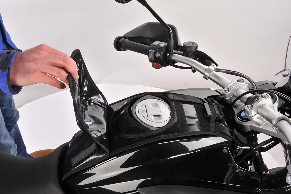 Zum Betanken mit einem Handgriff abklappbar. Die Systemhalterung ist schnell abnehmbar, kann aber auch am Fahrzeug verbleiben und schützt so den Lack. Zudem ist die Halterung auch zur Aufnahme des separat erhältlichen Kartenfachs ohne Verwendung des Tankrucksacks geeignet.