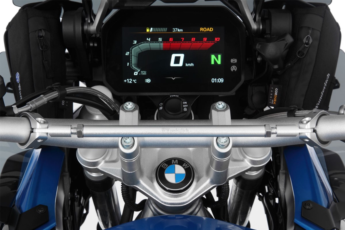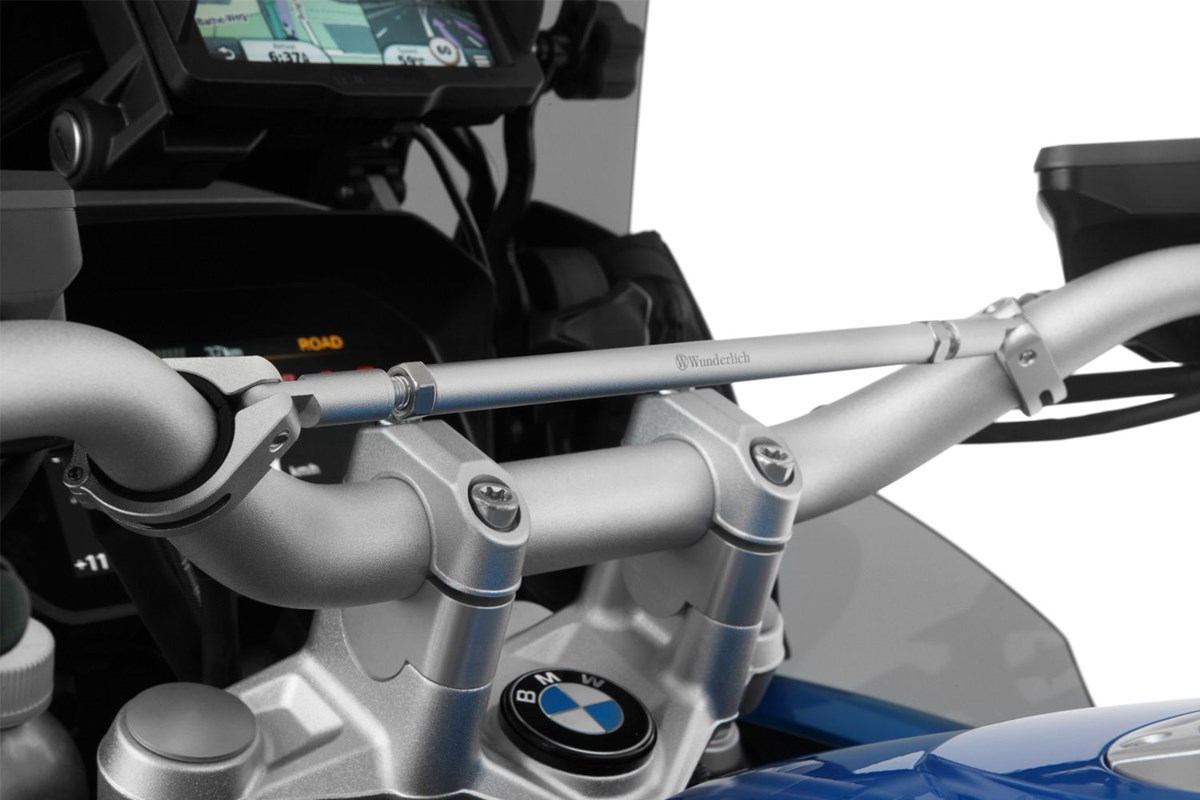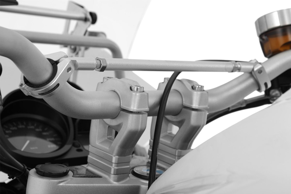 Die hochwertige silberne Lenkermittelstrebe aus Aluminium hat einen Durchmesser von 12 Millimetern, die Oberfläche ist glasperlengestrahlt. Neben der Betonung des Erscheinungsbilds, dient sie auch als perfekte Basis zum Anbringen von Zubehör. Die Befestigung der Mittelstrebe am Lenker erfolgt dazu mit elastischen Reduzierhülsen, so dass eine Entkopplung von Strebe und Lenker sichergestellt ist. Damit können insbesondere auch elektronische Geräte vibrationsgedämpft befestigt werden.