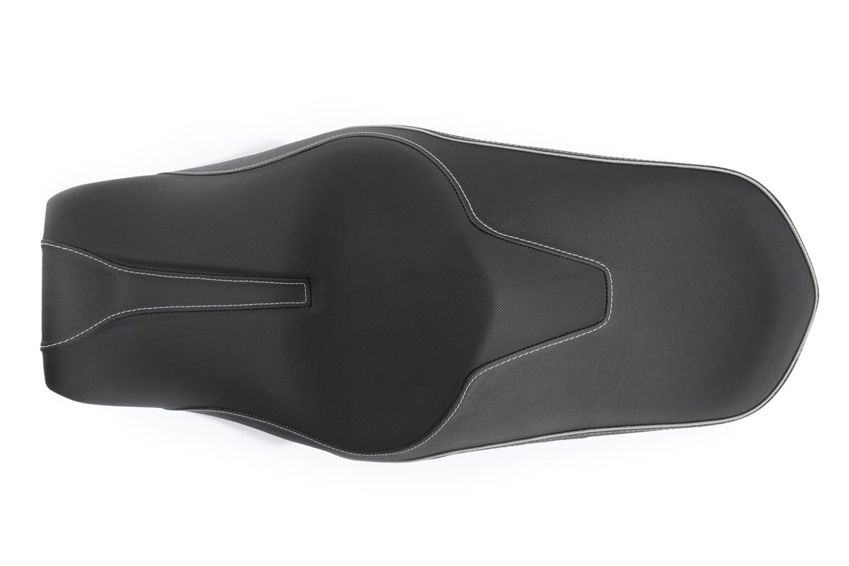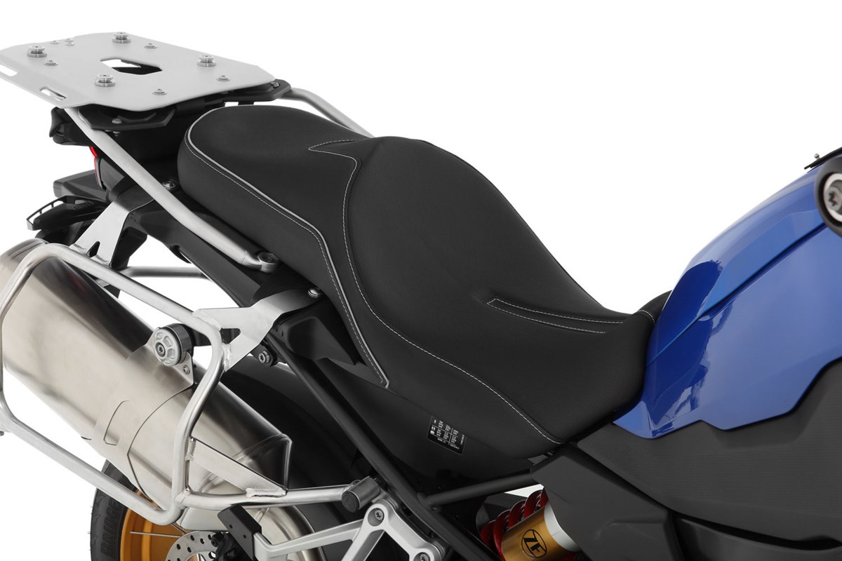 Auch unsere in der Sitzhöhe reduzierten Sitze fertigen wir mit einer charakteristischen, ergonomischen 3-D-Kontur, die Fahrer und Beifahrer mit ihrem BMW-Motorrad eins werden lässt. Form und Neigung des aufwändig verarbeiteten, progressiv aufgebauten, zweischichtigen Sitzbankkerns unterstützen die ergonomische vorteilhafte, natürliche Haltung des Beckens. So integriert, fährt es sich einfach entspannt und damit aktiv. Und, kein Zweifel, entspanntes Sitzen schafft ein Plus an passiver Sicherheit. Der integrierte Windkanal auf der Sitzfläche sorgt für eine angenehme Belüftung beim Fahren. Ein griffiges Bezugsmaterial erhöht ebenfalls den Komfort. Mit der ThermoPro Beschichtung liegt die Temperatur dieser Sitzbank im Hochsommer in praller Sonne um bis zu 25°C niedriger im Vergleich mit herkömmlichem, unbehandeltem Bezugsmaterial. Die tiefe Variante ist optimal für Fahrer, die sich einen sicheren Stand wünschen.