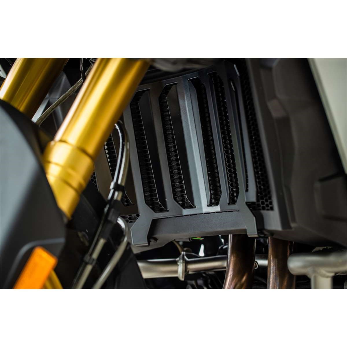 Die Luftleitbleche unseres Wasserkühlerschutzes »EXTREME« sind so ausgerichtet, dass sie für einen optimalen Luftdurchsatz sorgen. Dabei wird die Frontsilhouette des Kühlers jedoch so abgedeckt, dass das direkte Auftreffen von Steinschlag und Insekten auf dem empfindlichen Kühlernetz zuverlässig vermieden werden.