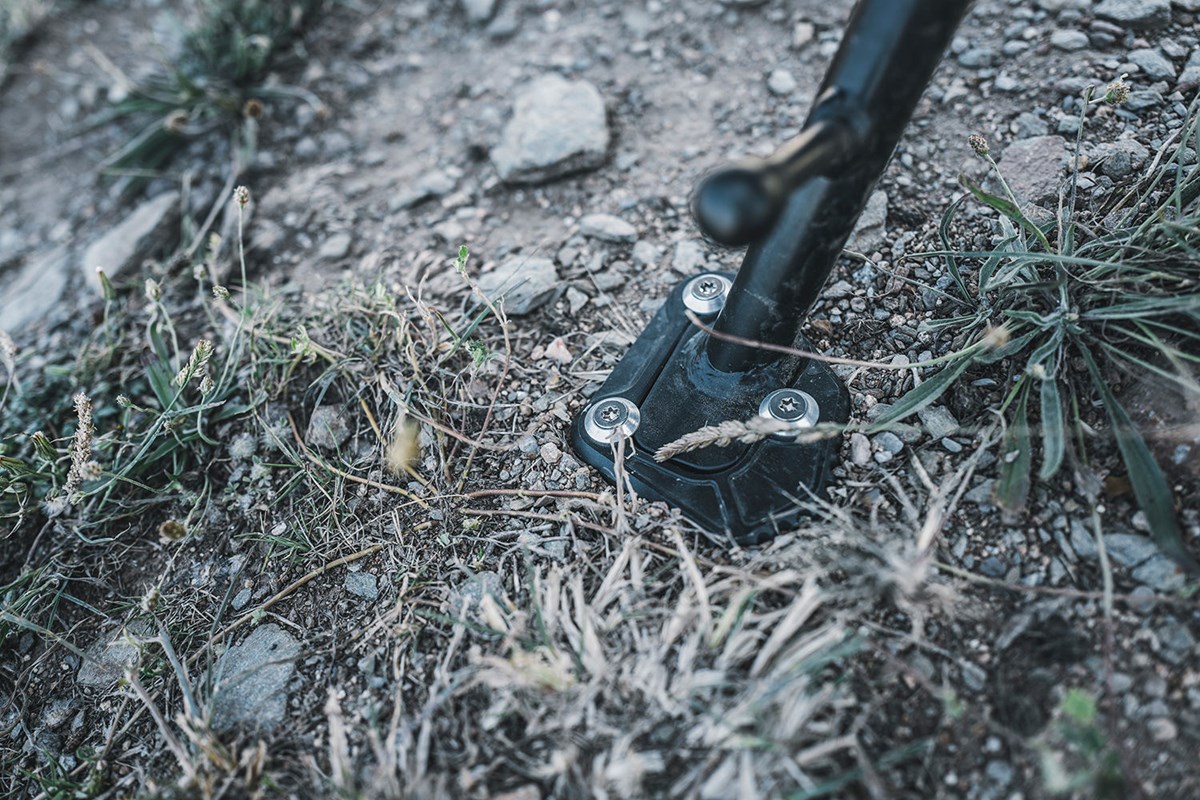 Die Zusatzversicherung für die werkstiefergelegte F 850 oder 750 GS: Gerade voll bepackt oder auf unbefestigten Untergrund droht die F 850/750 GS auf dem Seitenständer leicht zu versinken. Die genau formgefräste Verbreiterungsplatte wird schnell an den Seitenständer geschraubt und befreit die GS von dieser Gefahr.