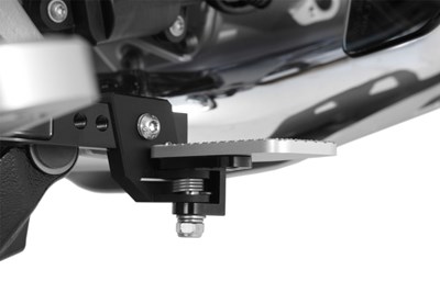 Wem der Kniewinkel auf Dauer zu eng und unkomfortabel ist, dem legen wir unser Rastensystem EVO 1 oder ERGO-COMFORT ans Herz. Dabei gilt es zu bedenken, dass der Tritt aufs Bremspedal stets intuitiv erfolgt. Das Bremspedal und seine räumliche Anordnung in Relation zur Fußraste muss einfach passen. Wer also die Fußrasten tiefer legen möchte, um den Kniewinkel zu vergrößern, dem empfehlen wir unbedingt unsere passende Fußbremshebel-Tieferlegung. Denn verlegt man die Fußraste nach unten, ist das Bremspedal zwangsläufig zu hoch angeordnet. Unsere Fußbremshebeltieferlegung sorgt für die notwendige Anpassung, indem der Fußbremshebel ebenfalls tiefer gelegt wird. Dazu setzen wir einen Aluminiumadapter ein, mit dem wir den Anschlag des Fußpedals um ca. 10 mm absenken. Damit stimmt die Ergonomie zwischen Fußraste und Bremshebel wieder. Und diese kleine Maßnahme erhöht die passive Sicherheit.