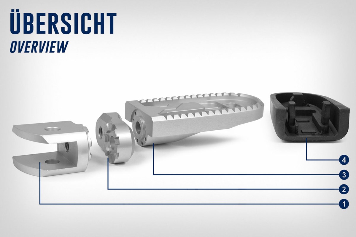 An dem Adapter wird nun die silberfarbene (Art.Nr. 25911-001) oder schwarze Fußraste (Art.Nr. 25911-002) befestigt, sie kann optional mit einem Rastengummi (Art.Nr. 25913-002) versehen werden.