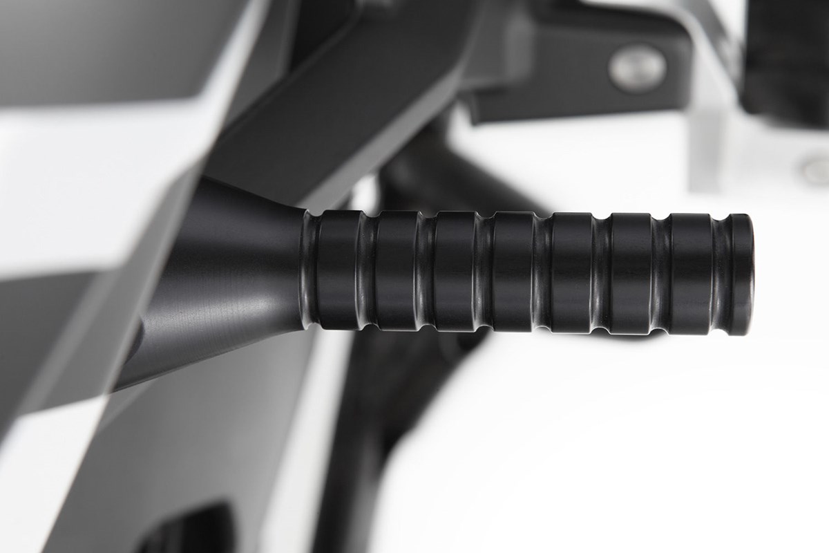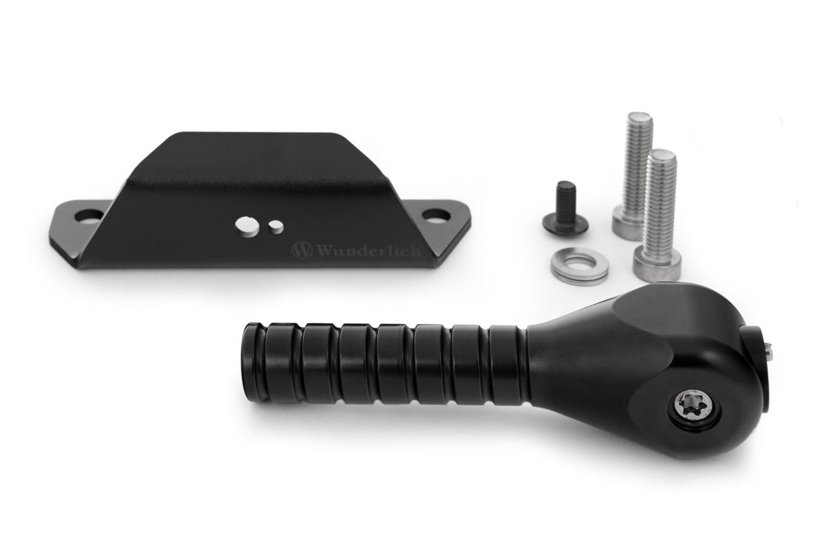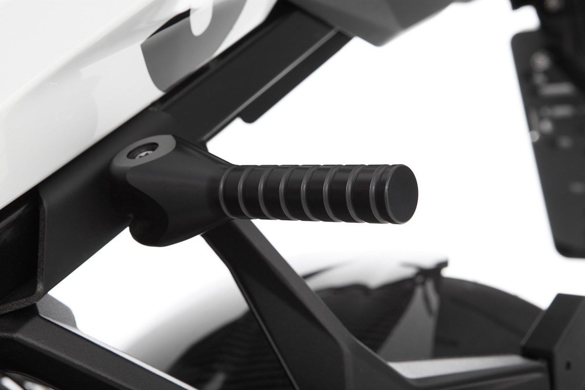 Sehr, sehr hilfreiches und ergonomisches Bauteil. Optimiert das Hebelverhältnis - nicht nur bei voll beladener Maschine. Dieser ausklappbare Aufbockgriff wird am Rahmen der linken Soziusraste mit einer soliden passgenauen Konsole montiert. Ausgeklappt lässt sich die Maschine spürbar leichter und sicherer auf den Hauptständer aufstellen. Dies liegt daran, dass der rutschsichere Griff gut in der Hand liegt und man damit deutlich mehr Kraft übertragen kann, als an Rahmenrohren, die schlecht zu greifen sind oder durchs Gepäck gar nicht zugänglich sind. Nach dem Aufbocken verschwindet der Griff unauffällig in seiner Ruheposition. Ein Mechanismus sorgt für die sichere Arretierung des Griffs in der eingeklappten Position. Wir fertigen unseren Aufbockgriff sehr hochwertig aus Aluminium, das Design ist funktional.