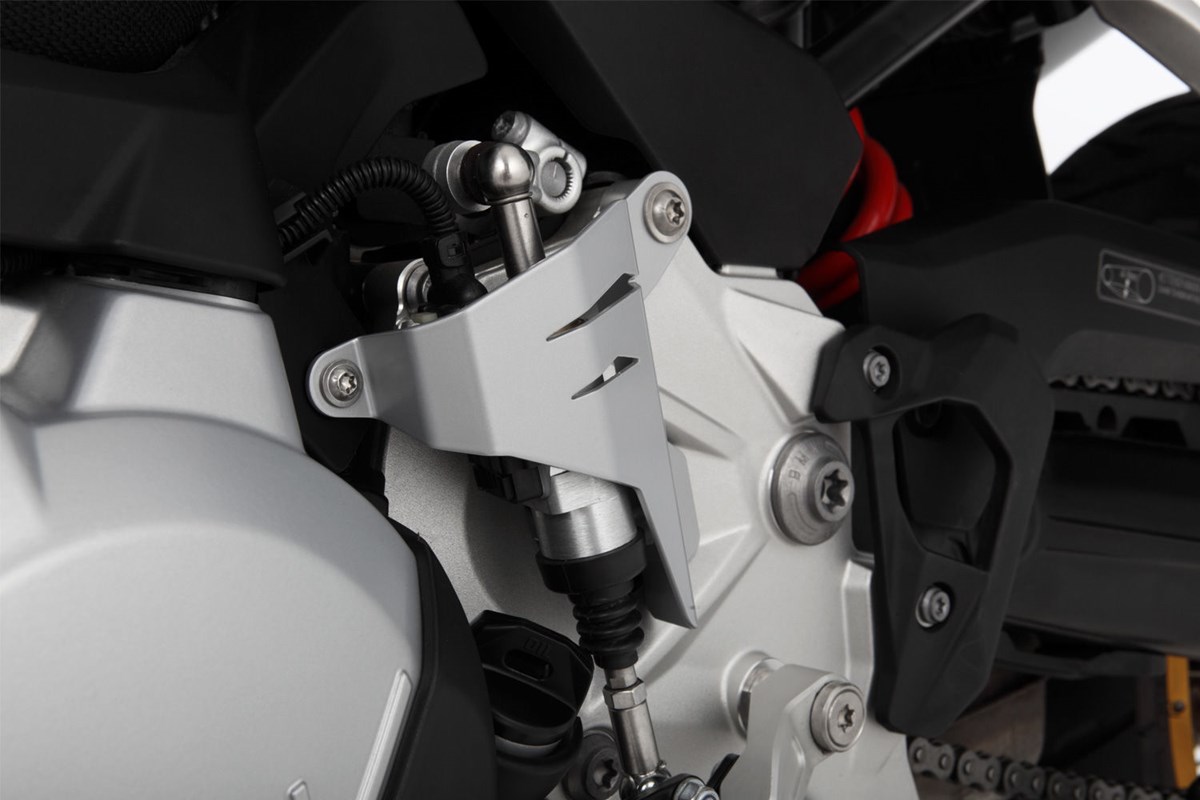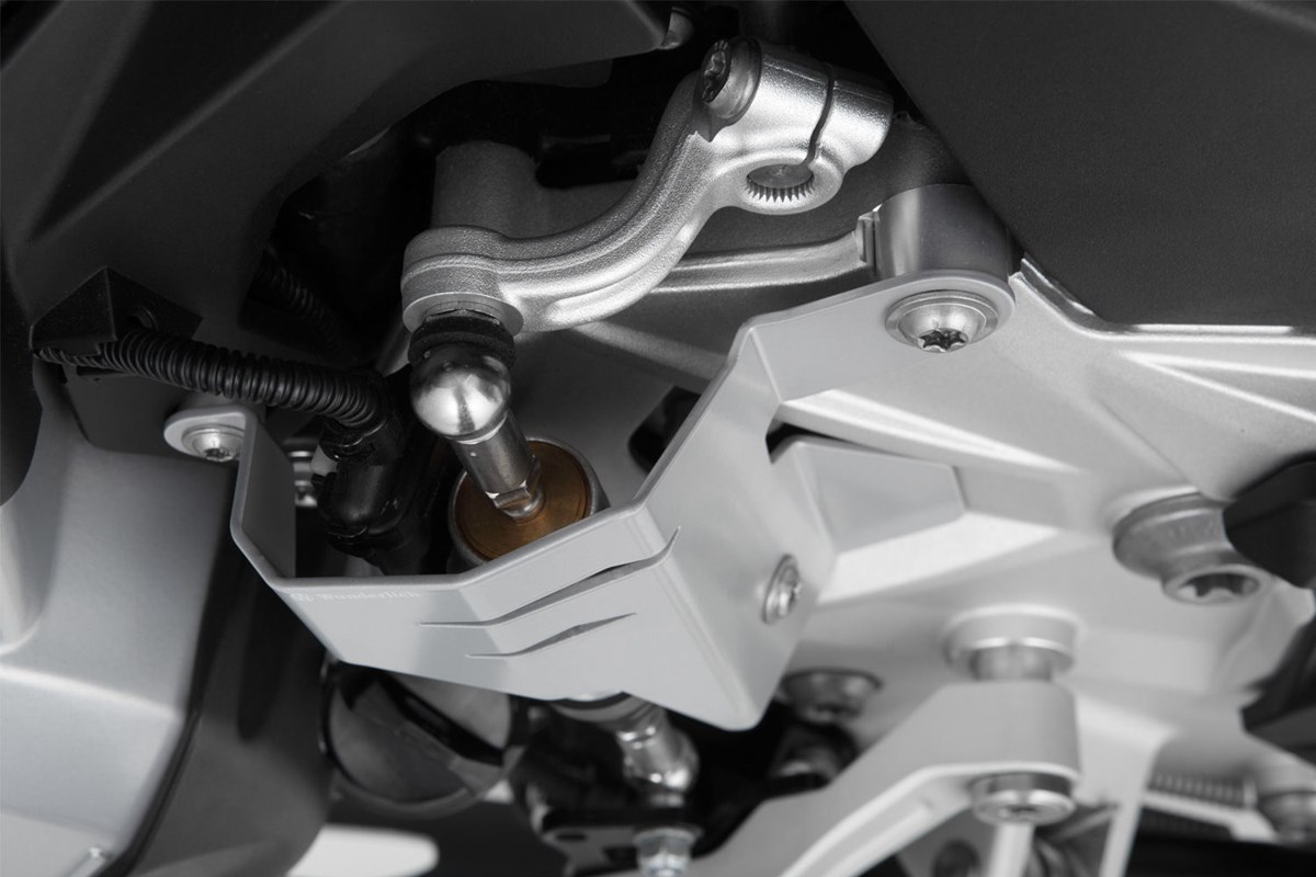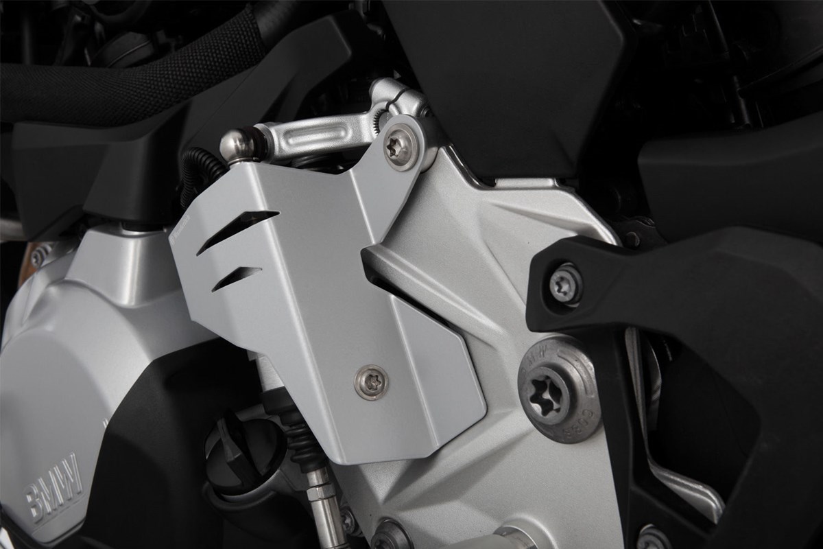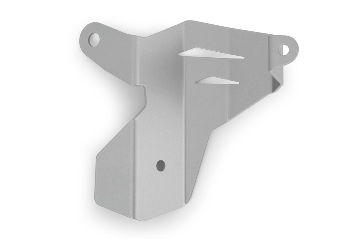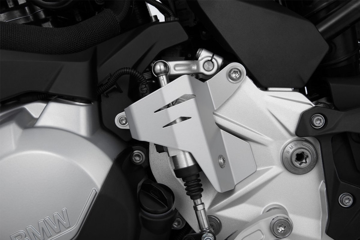 Solider mechanischer Schutz für den Schaltassistenten der F 750/850 GS, der durch sein Design sehr sportlich anmutet und sich somit ins Design der GS einfügt. Die hohe Schutzwirkung ergibt sich aus der Steifigkeit des gekanteten, teils durchbrochenem 2 mm-Aluminiumblechs. Es umrahmt den exponierten, teuren Schaltassistenten mit seiner anständigen Dreipunktbefestigung und schützt diesen sicher.