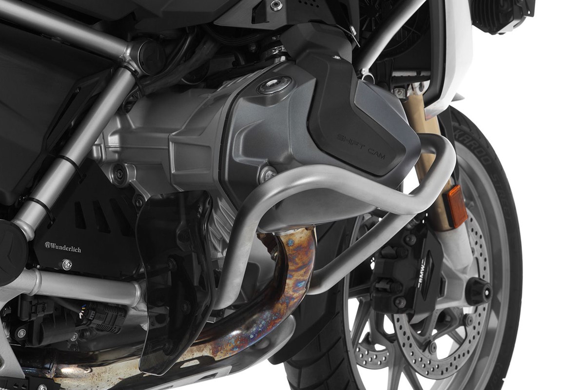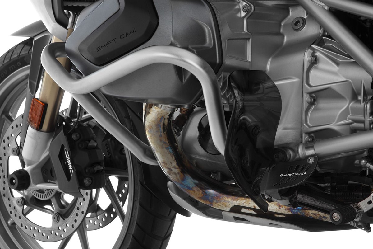 Der Motorschutzbügel schützt nicht nur zuverlässig die Zylinder und Ventildeckel, sondern auch die beiden Lambdasonden. Das Rundumschutzkonzept erhöht die passive Sicherheit und damit die Freude beim Fahren. Im Falle eines Sturzes oder Umfallers werden die wirkenden Kräfte optimal über die Schutzbügelstruktur auf die belastbaren Aufnahmepunkte verteilt, sodass Kraftspitzen vermieden werden.