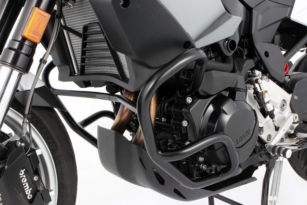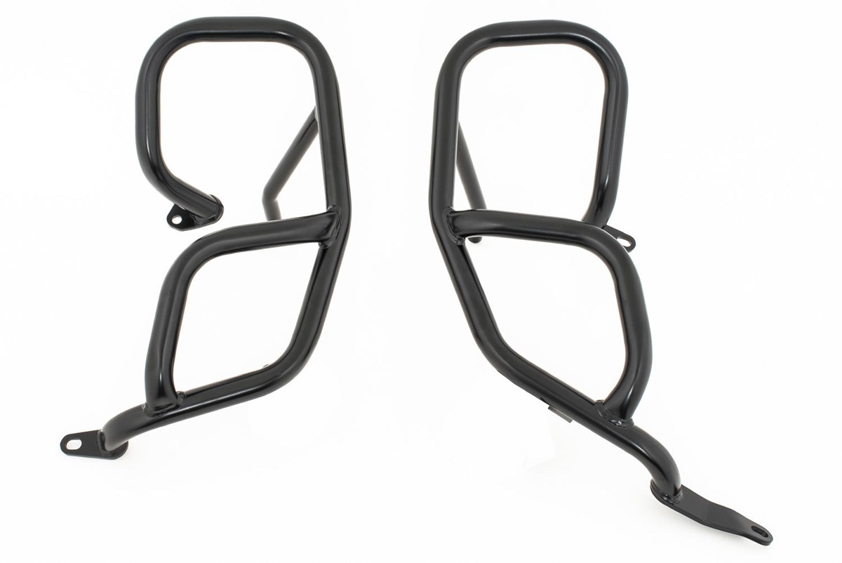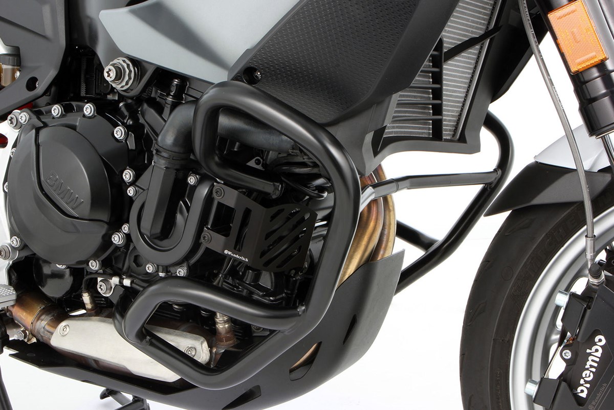 Bei unserem »EXTREME« Motorschutzbügelkonzept steht die maximale Schutzwirkung im Vordergrund der Entwicklung. Durch dessen Bauteilgeometrie sind der Motor, insbesondere die Wasserpumpe, die Kupplung und Lichtmaschine sowie deren Gehäuseabdeckungen perfekt und zuverlässig geschützt. Neben dem umfassenden Schutzeffekt haben wir Boden- und Schräglagenfreiheit im Rahmen der Entwicklung und Konstruktion größte Bedeutung beigemessen. So schmiegt sich der zweiteilige asymmetrische Motorschutzbügel eng an und gewinnt durch seine spezifische Struktur zusätzlich an Stabilität und Steifigkeit – und dies, bei gleichzeitig optimiertem Bauteilgewicht. Die Bügel für die rechte und die linke Seite werden jeweils an drei ausgewählten Aufnahmepunkten verschraubt. Die bei einem Sturz oder Umfaller auftretende Momente und Kräfte werden damit auf je drei Punkte pro Fahrzeugseite verteilt. Das reduziert die Belastungsspitzen beim Auftreffen äußerer Kräfte. Die Montage ist leicht zu bewerkstelligen.