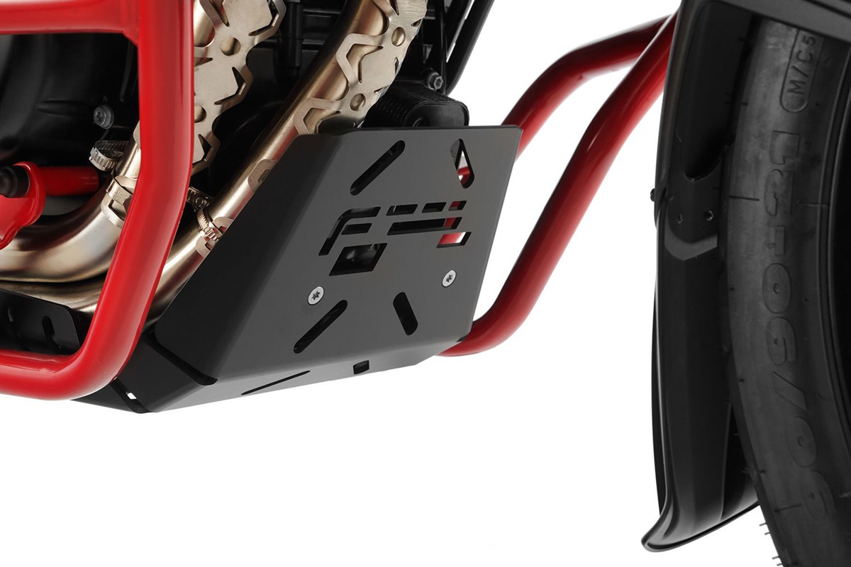 Wegen eines kapitalen Motorgehäuseschadens (mit Originalschutz) mussten wir zwingend einen stabilen Schutz entwickeln, der Motor, Krümmer und Sammler richtig schützt. Hintergrund: Beim harten Aufsetzen oder Hängenbleiben kann der originale Schutz an der vorderen Halterung abscheren und die hinteren, starren Halter knicken sich in den Motorblock hinein.