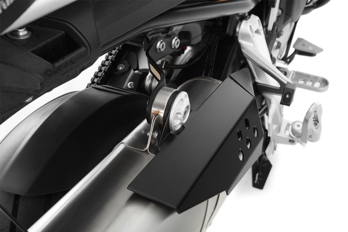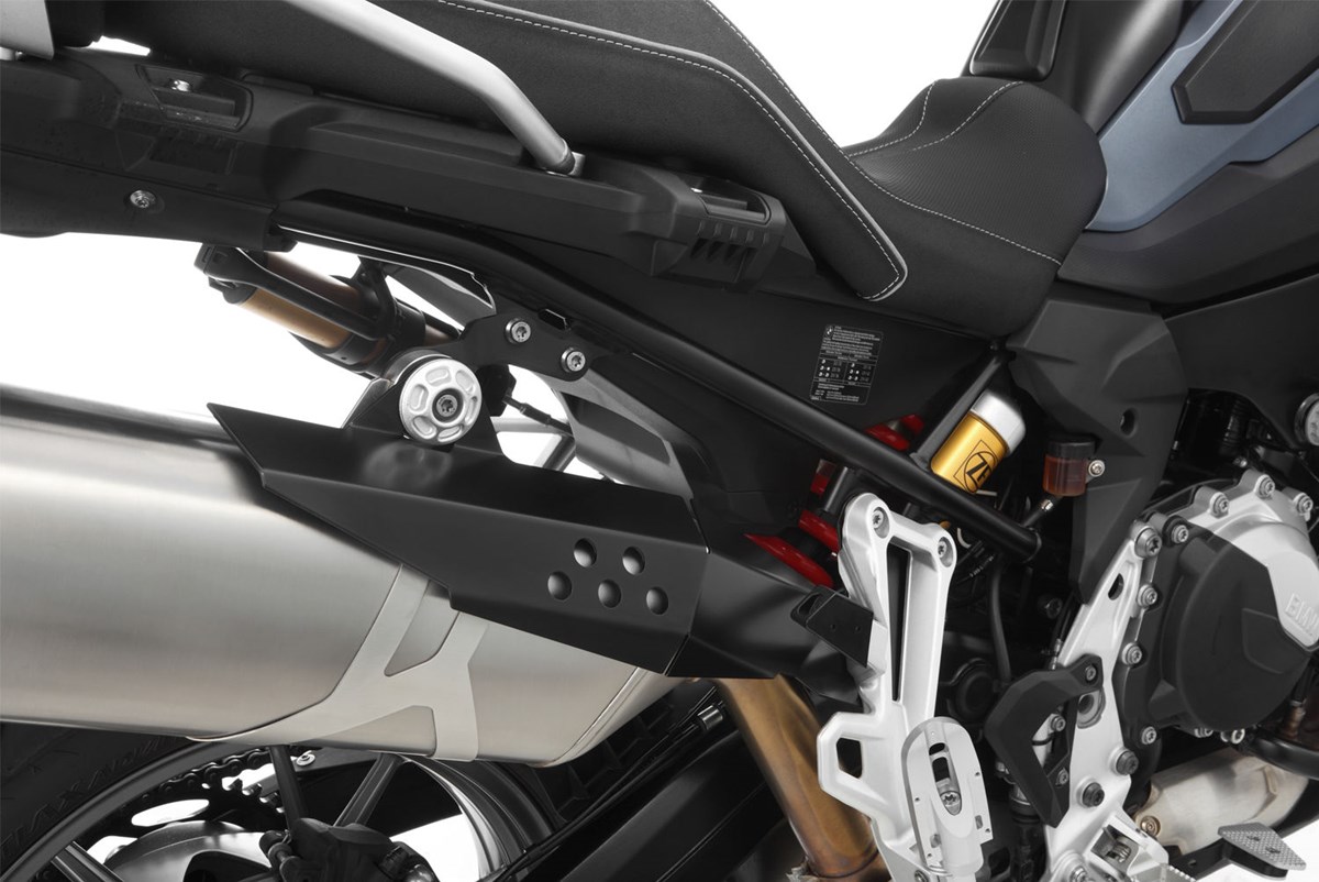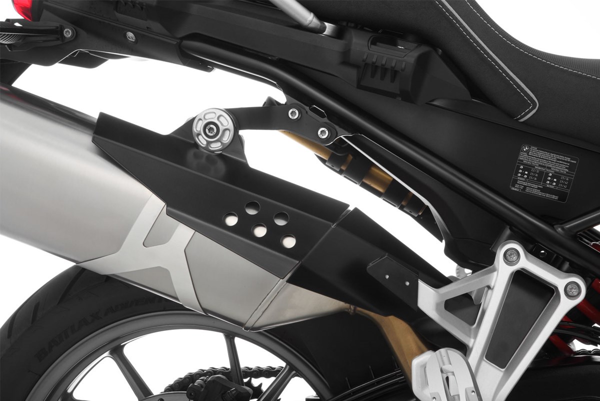 Thermischer und mechanischer Schutz, der die Strahlungshitze im vorderen Bereich des Endschalldämpfers zuverlässig abschirmt und den Kontakt mit dem heißen Auspuff an den neuralgischen Punkten vermeidet. Damit schützt er vor schmerzhaften Brandverletzungen und verhindert Beschädigungen am Gepäck durch thermische Einflüsse. Gleichzeitig bietet der Hitzeschutz eine hohe mechanische Schutzwirkung gegen Kratzer oder Dellen für den Endschalldämpfer, die leicht beim Fahren im Gelände durch oder bei einem unglücklichen Umfaller entstehen können. Die strukturelle Stabilität der langlebigen Konstruktion ergibt sich aus der Mehrpunktbefestigung und der Steifigkeit des präzise gekanteten, teils durchbrochenen, schwarz pulverbeschichteten Edelstahls. Sportliches, integriertes Design, das sich mit ins Layout der GS einfügt. Die passgenaue Montage mit Hilfe des beiliegenden Montagekits ist denkbar einfach. Sie erfolgt an den originalen Anschraubpunkten.