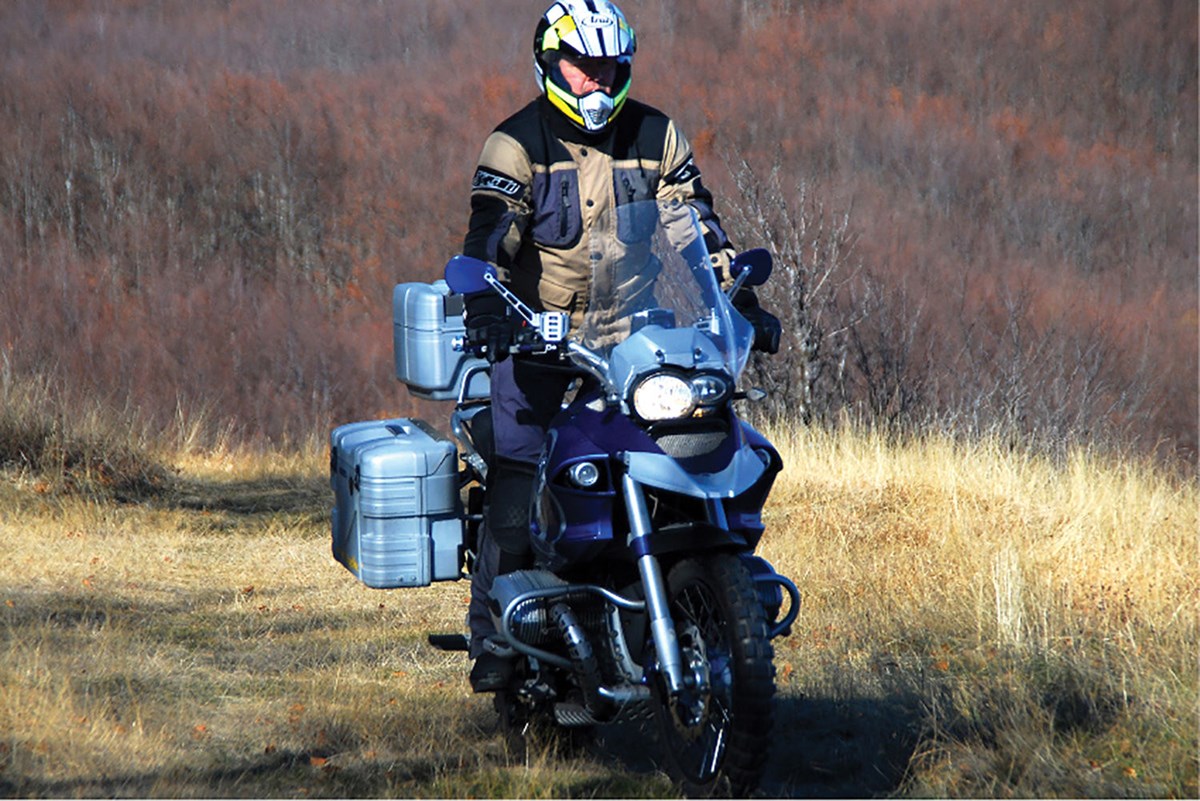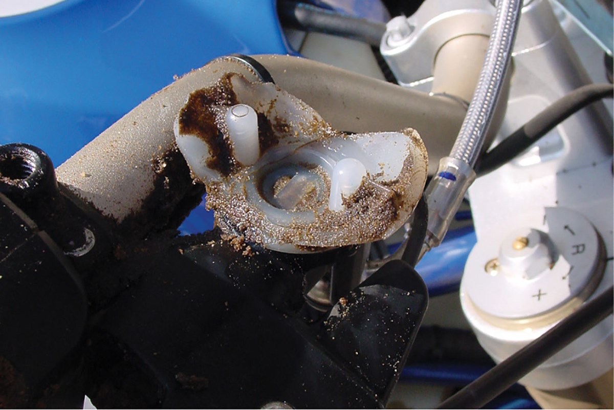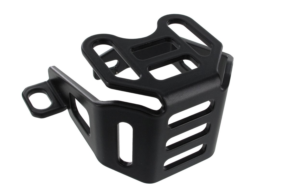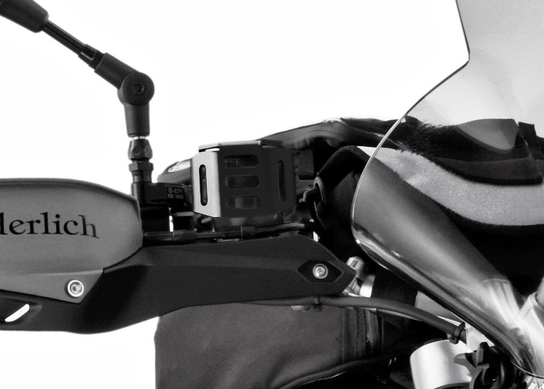 Eine teure Reparatur und nicht selten der Urlaubsabbruch sind die Folge. Drei kaputte Bremsbehälter später haben wir diesen Schutz entwickelt, der sich über eine konstruktiv komplexe Halterung direkt an der Lenkerverschraubung abstützt und noch zusätzlich am Protektorenhalter -(Protektoren müssen nicht montiert sein) befestigt wird. Deshalb machte es Sinn, dickwandiges Aluminium zu -verwenden, das Schläge an die ausgeklügelten Halter weitergeben kann, ohne selbst zerstört zu werden.