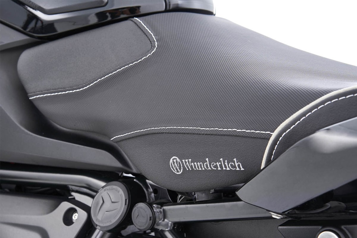 Sie bieten perfekten Halt und aktive, sichere Kontrolle bei forcierter Fahrt, ganz besonders auch beim Bremsen: Wer kennt das nicht, wenn die Sozia beim Ankern plötzlich von hinten schiebt und man sich unvermittelt abstützen und gleichzeitig, in einer vielleicht brenzligen Lage, auch noch lenken muss. Mit Wunderlichs eigens entwickelter Stützkontur gehören diese Schreckmomente beim Bremsen der Vergangenheit an. Die innovative, ergonomische 3-D-Kontur sorgt auch dafür, dass Druckstellen an den Innenschenkeln beim Stehen an der Ampel, passé sind.