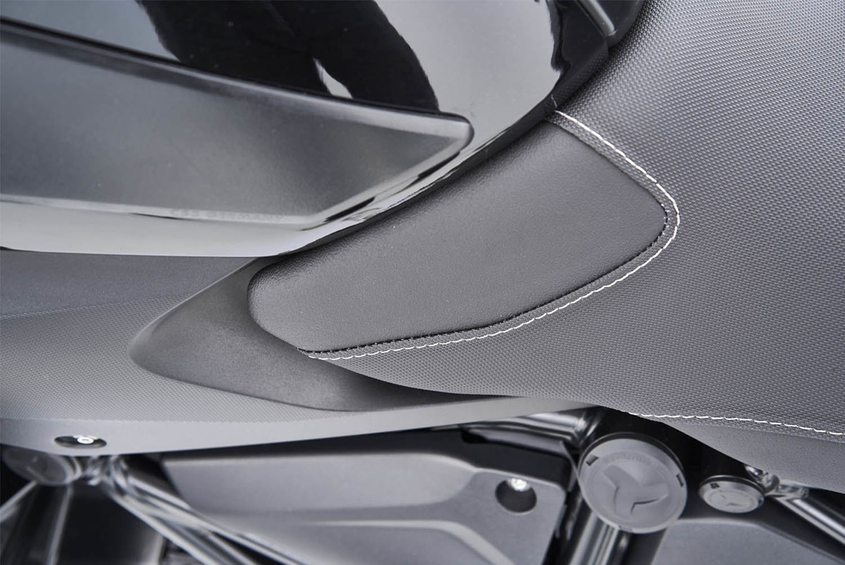Auch unsere um 20mm gegenüber der Standardsitzhöhe erhöhten Sitze fertigen wir mit der charakteristischen, ergonomischen 3-D-Kontur, die Fahrer und Beifahrer mit ihrem BMW-Motorrad eins werden lässt. Form und Neigung des aufwändig verarbeiteten, progressiv aufgebauten, zweischichtigen Sitzbankkerns unterstützen die ergonomische vorteilhafte, natürliche Haltung des Beckens. So integriert, fährt es sich einfach entspannt und damit aktiv. Und, kein Zweifel, entspanntes Sitzen schafft ein Plus an passiver Sicherheit. Der integrierte Windkanal auf der Sitzfläche sorgt für eine angenehme Belüftung beim Fahren. Ein griffiges Bezugsmaterial erhöht ebenfalls den Komfort. Mit der ThermoPro Beschichtung liegt die Temperatur dieser Sitzbank im Hochsommer in praller Sonne um bis zu 25°C niedriger im Vergleich mit herkömmlichem, unbehandeltem Bezugsmaterial. Die tiefe Variante ist optimal für Fahrer, die sich einen sicheren Stand wünschen.