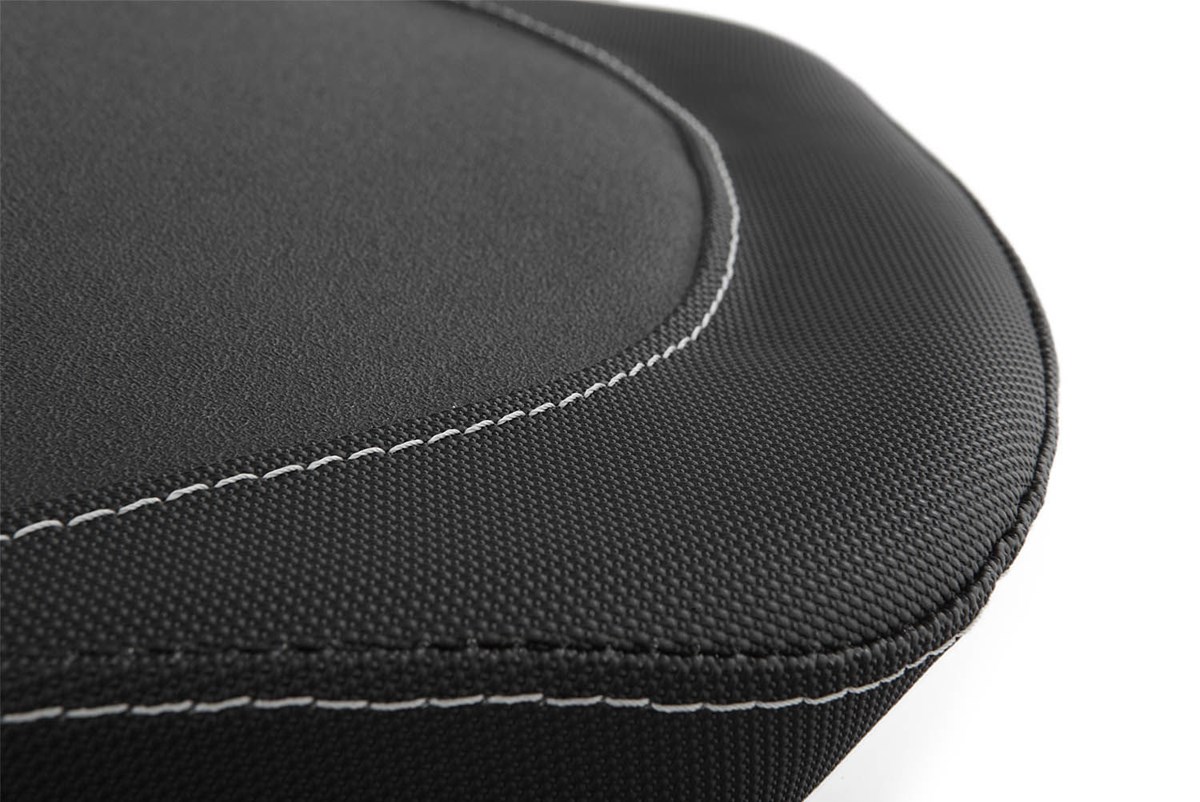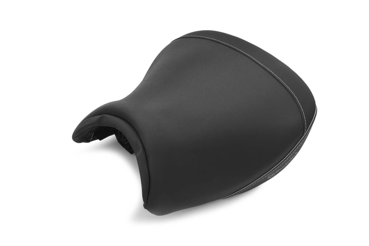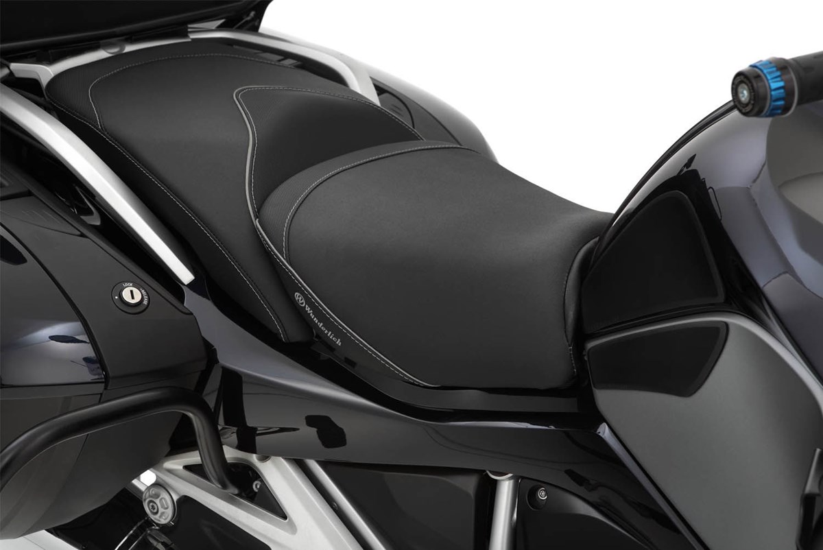 Wir fertigen unsere Sitze mit einer charakteristischen, ergonomischen 3-D-Kontur, die den Fahrer mit seinem BMW-Motorrad eins werden lässt. Form und Neigung des aufwändig verarbeiteten, progressiv aufgebauten, zweischichtigen Sitzbankkerns, in den ein Sitzheizungselement integriert ist, unterstützen die ergonomische vorteilhafte, natürliche Haltung des Beckens. So integriert, fährt es sich einfach entspannt und damit aktiv. Und, kein Zweifel, entspanntes Sitzen schafft ein Plus an passiver Sicherheit. Mit der ThermoPro Beschichtung liegt die Temperatur dieser Sitzbank im Hochsommer in praller Sonne um bis zu 25°C niedriger im Vergleich mit herkömmlichem, unbehandeltem Bezugsmaterial. Passend dazu haben wir eine Beifahrersitzbank im Programm.