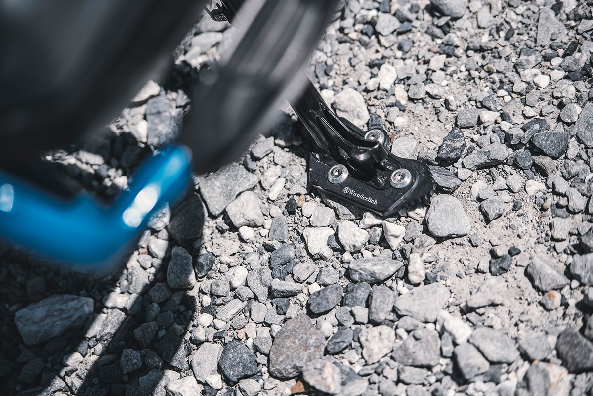 Die Zusatzversicherung für die BMW: Gerade voll bepackt, droht eine BMW auf dem Seitenständer leicht zu versinken. Eine genau formgefräste Verbreiterungsplatte, die schnell an den Seitenständer geschraubt wird und die BMW von dieser Gefahr befreit.