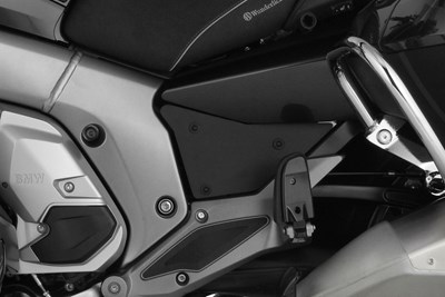 Durch die Lücke im Rahmendreieck zwischen Seitendeckel und Sozia-Fußraste sind die Beine und Füße schutzlos Nässe und Schmutz ausgesetzt. Ungehindert schleudert das Wasser über die Stiefel bis über die Oberschenkel. Massive Durchnässung und Verschmutzung des Fahrers und der Sozia sind die Folge. Zudem verteilen sich Schmutz und Wasser über die Seitendeckel, Koffer und Rastenträger.