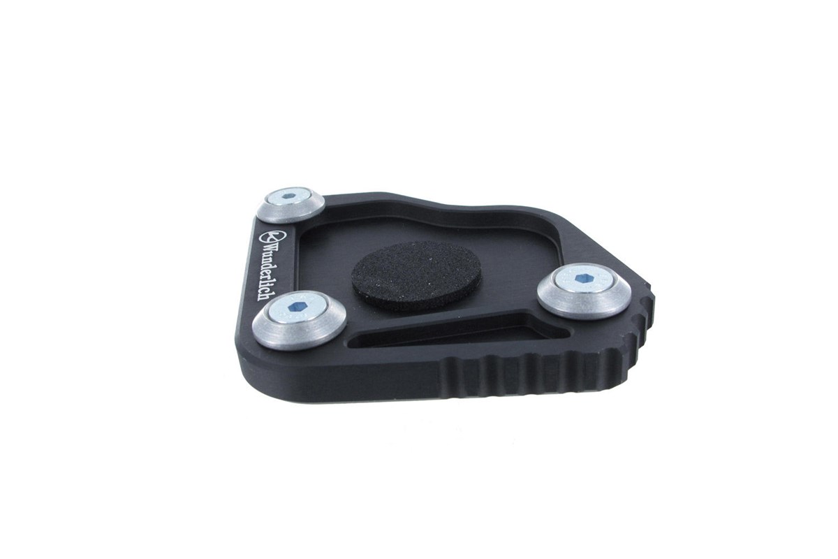 Die Zusatzversicherung für die BMW: Gerade voll bepackt, droht eine BMW auf dem Seitenständer leicht zu versinken. Eine genau formgefräste Verbreiterungsplatte, die schnell an den Seitenständer geschraubt wird und die BMW von dieser Gefahr befreit. Die Fakten: