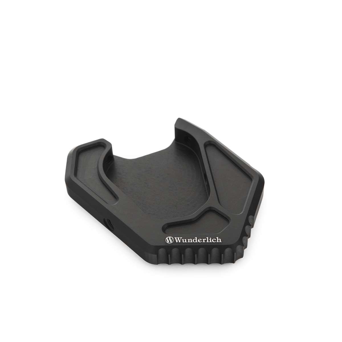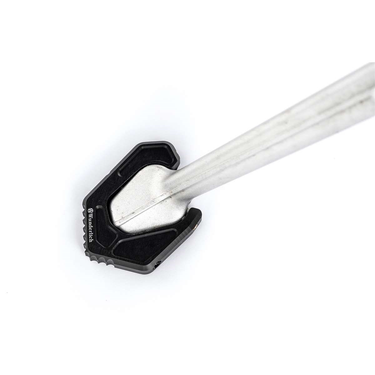 Die Lebensversicherung für Ihre BMW: Durch die zu kleine Aufstandsfläche des Original-Seitenständers besteht die Gefahr des langsamen -oft unbemerkten- Einsinkens Ihrer BMW sowohl auf heißen Teerflächen als auch bei nur leicht aufgeweichtem Untergrund. Im schlimmsten Fall fällt die Maschine um. Ärgerliche Beschädigungen sind oft die Folge. Abhilfe schafft unsere präzise formgefräste Auflagevergrößerung, die einfach an den Seitenständer geschraubt wird und diesen konstruktiven Mangel wirkungsvoll beseitigt. Und damit der Seitenständer sicher mit der Stiefelferse ausgeklappt werden kann, haben wir eine griffige Außenverzahnung eingearbeitet.
