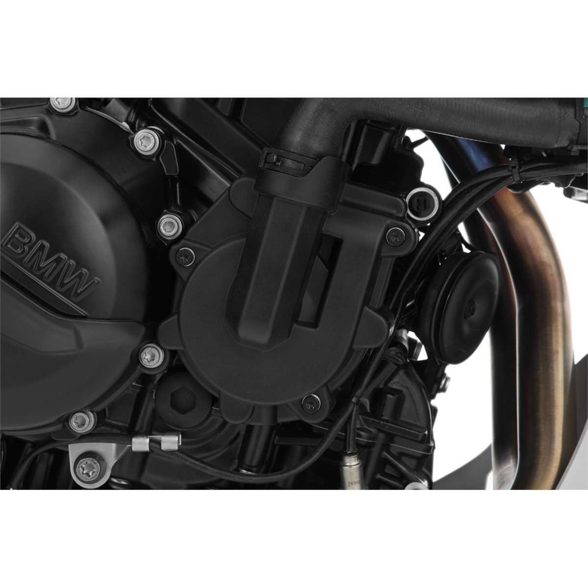 An der rechten Motorseite sitzt die Wasserpumpe weit vorn an herausgehobener Stelle. Sie ist leicht an dem zum Kühler führenden Schlauch erkennbar. Das Wasserpumpengehäuse und damit die Funktion der Wasserpumpe ist bei einem unglücklichen Umfaller oder bei einem Sturz gefährdet. Deshalb halten wir es für sinnvoll, dieses Aggregat mit einem zusätzlichen Schutzcover zu versehen. Denn ein Ausfall der Wasserpumpe bedeutet immer, dass die Fahrt unterbrochen ist, ansonsten droht ein kapitaler Motorschaden, weil die Kühlung nicht mehr gewährleistet ist.