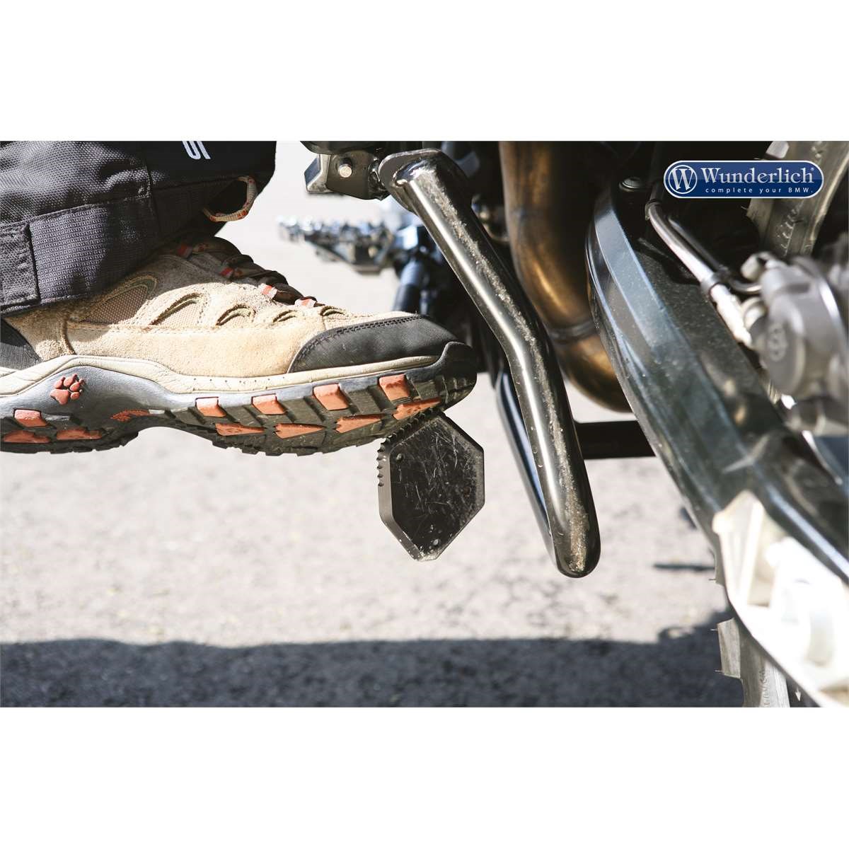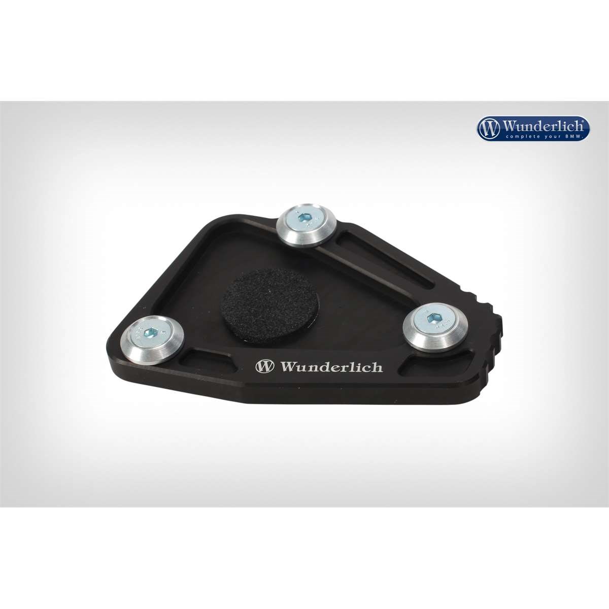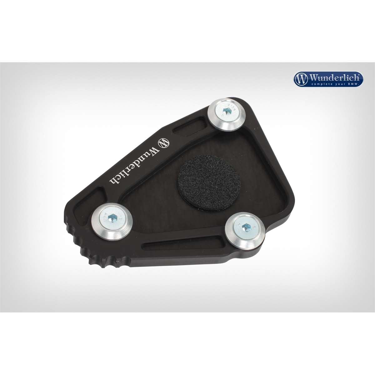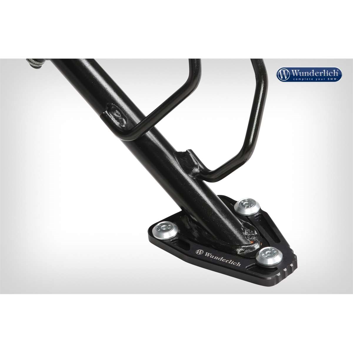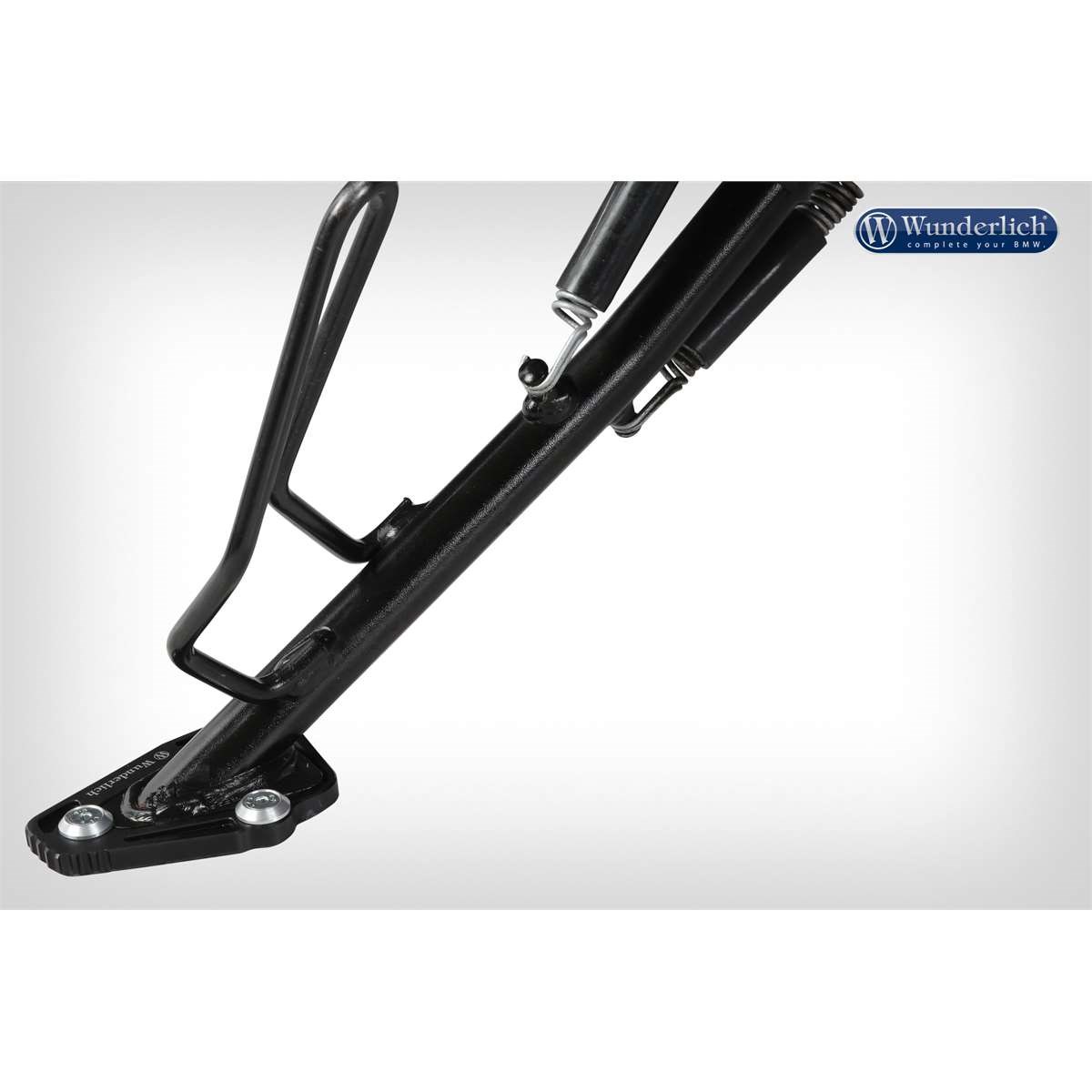 Die Zusatzversicherung gegen Umfaller: Schon unbeladen droht die Maschine auf dem Seitenständer schnell zu versinken. Diese formgefrästen Verbreiterungen, die schnell an den Seitenständer geschraubt sind, schützen sicher vor unangenehmen Überraschungen.