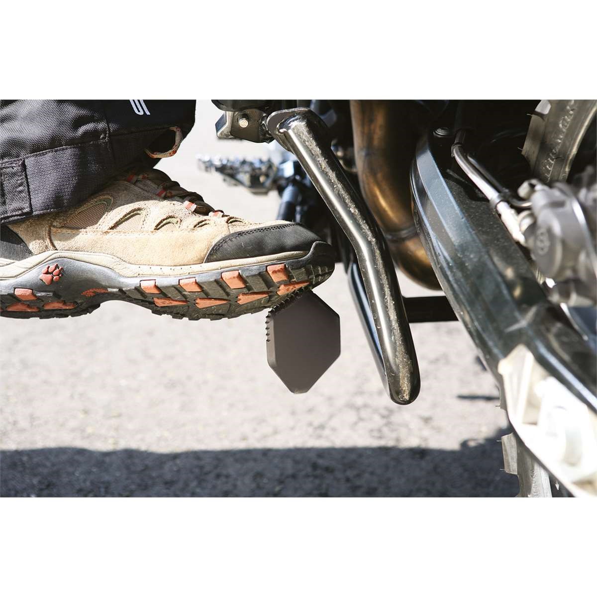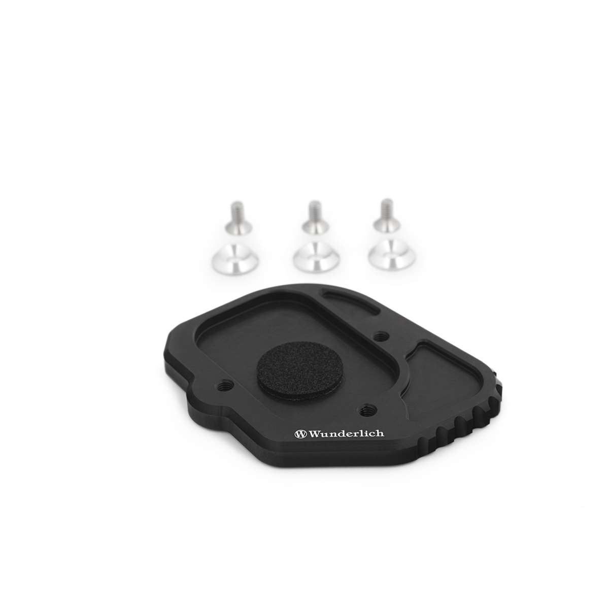 Die Lebensversicherung für Ihre BMW: Durch die kleine Aufstandsfläche des Original-Seitenständers besteht die Gefahr des langsamen, oft unbemerkten Einsinkens Ihrer BMW sowohl auf heißen Teerflächen als auch bei nur leicht aufgeweichtem Untergrund. Eine genau formgefräste Auflagenvergrößerung, die schnell an den Seitenständer geschraubt wird, beseitigt wirkungsvoll diesen konstruktiven Mangel. Und damit der Seitenständer locker mit der Stiefelferse ausgeklappt werden kann, haben wir eine Außenverzahnung eingearbeitet.