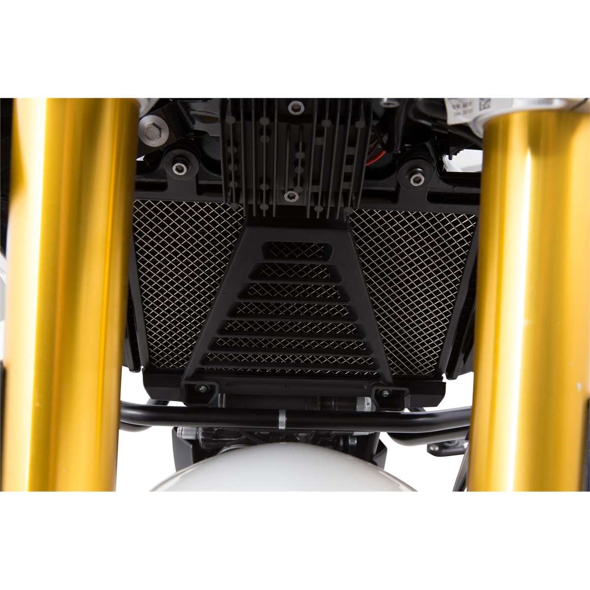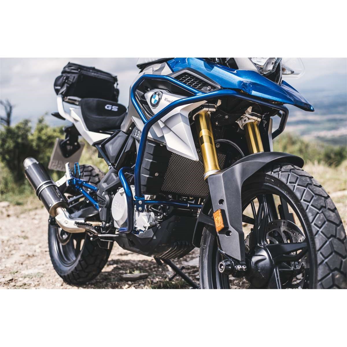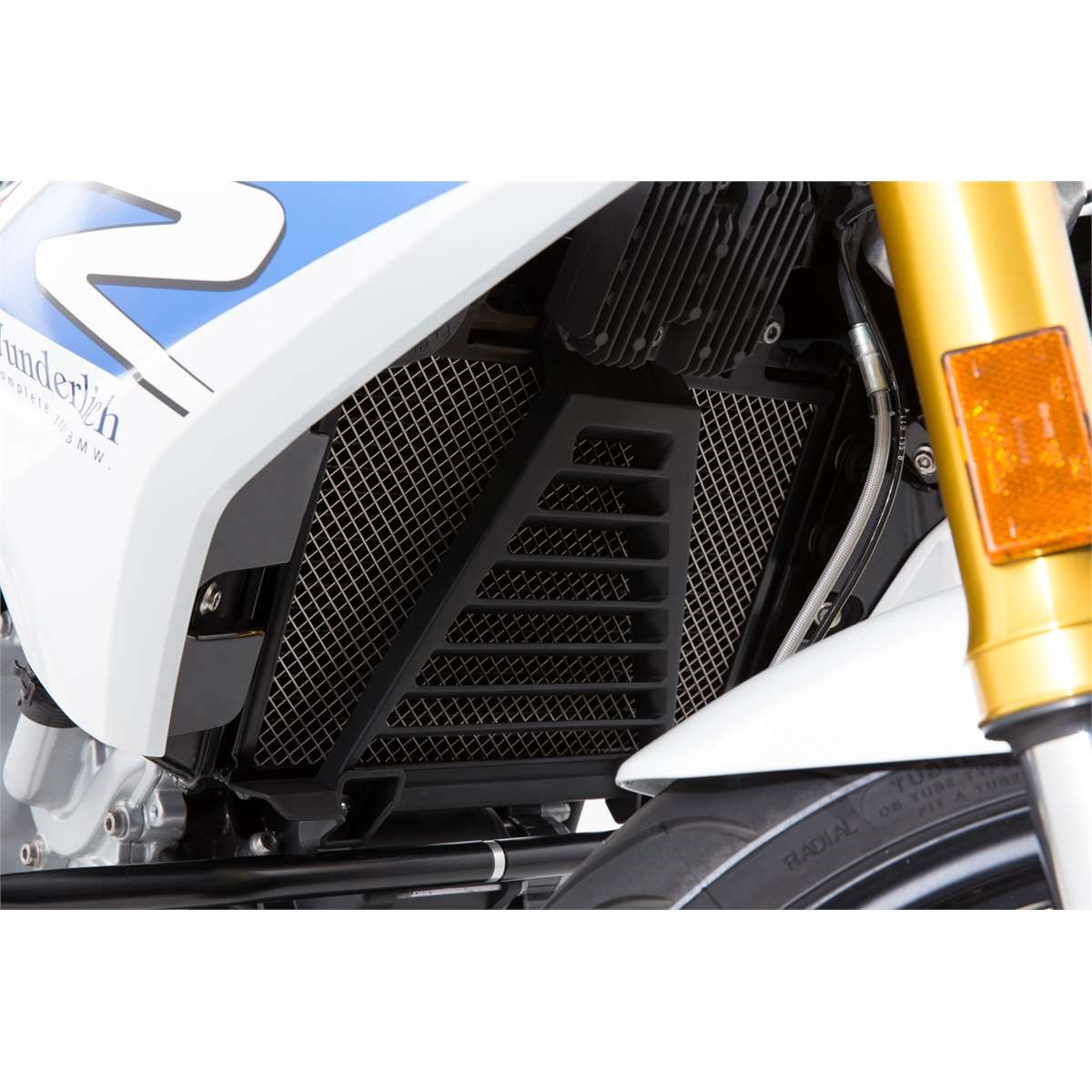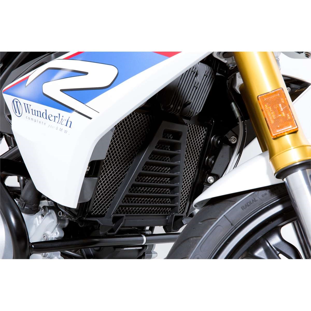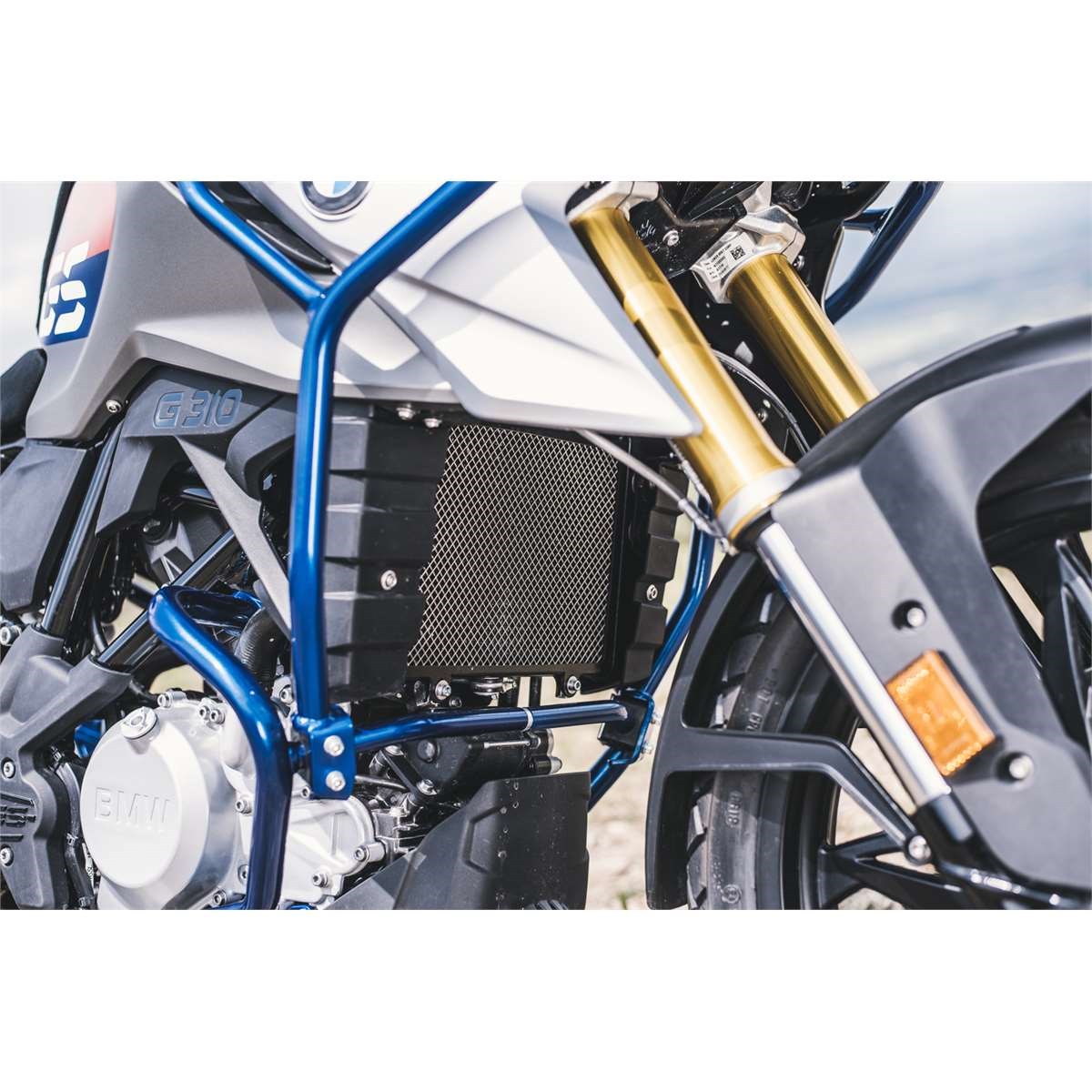 Der Wasserkühler der G 310 ist durch Steinschlag gefährdet. Fliegen und sonstiger Unrat sammeln sich schnell in den feingliedrigen Verrippungen. Das Säubern gestaltet sich äußerst umständlich und erfordert viel Handarbeit. Das feinmaschige VA-Gitter unseres Kühlerschutzes schützt den Kühler wirkungsvoll vor Beschädigungen und sorgt auf Dauer für optimalen Kühlluftdurchsatz und bedeutend weniger Putzaufwand.