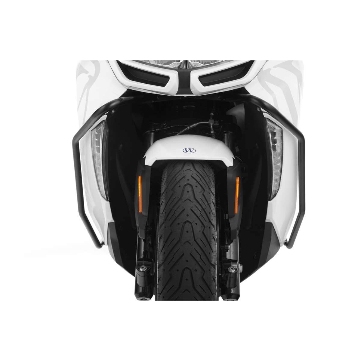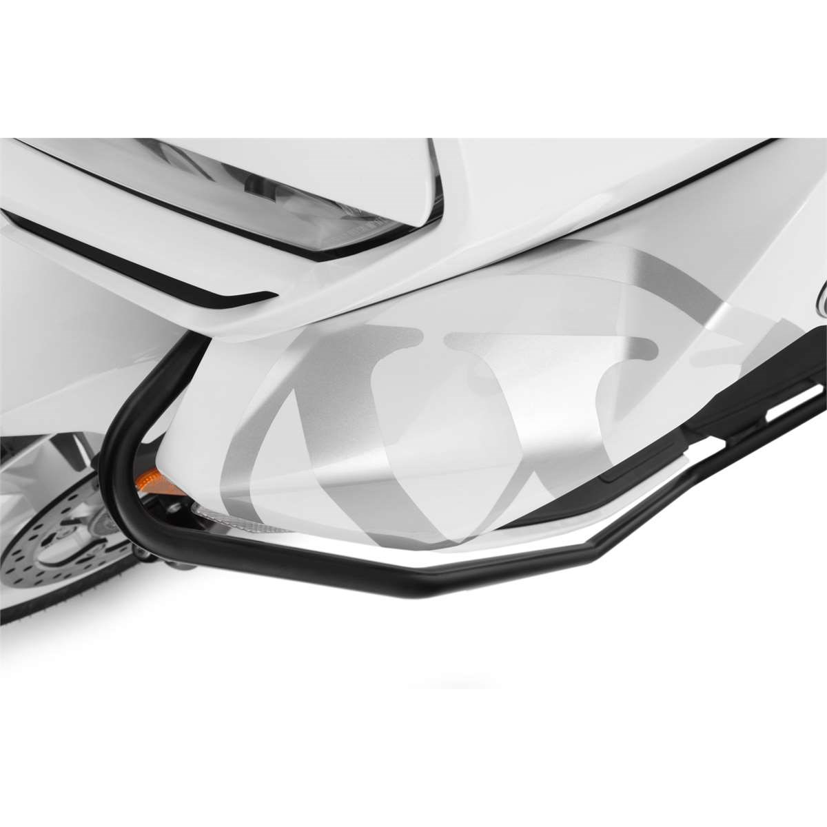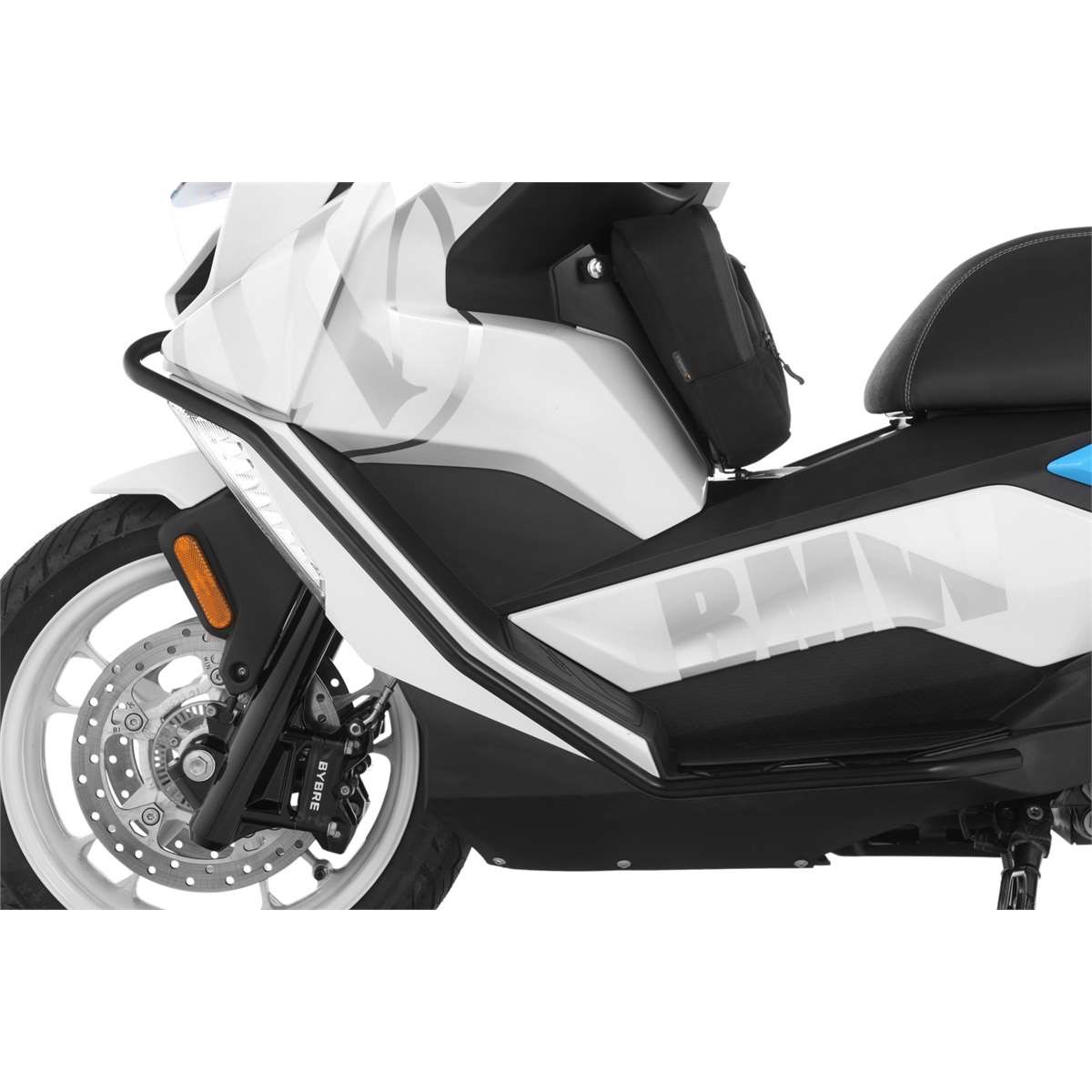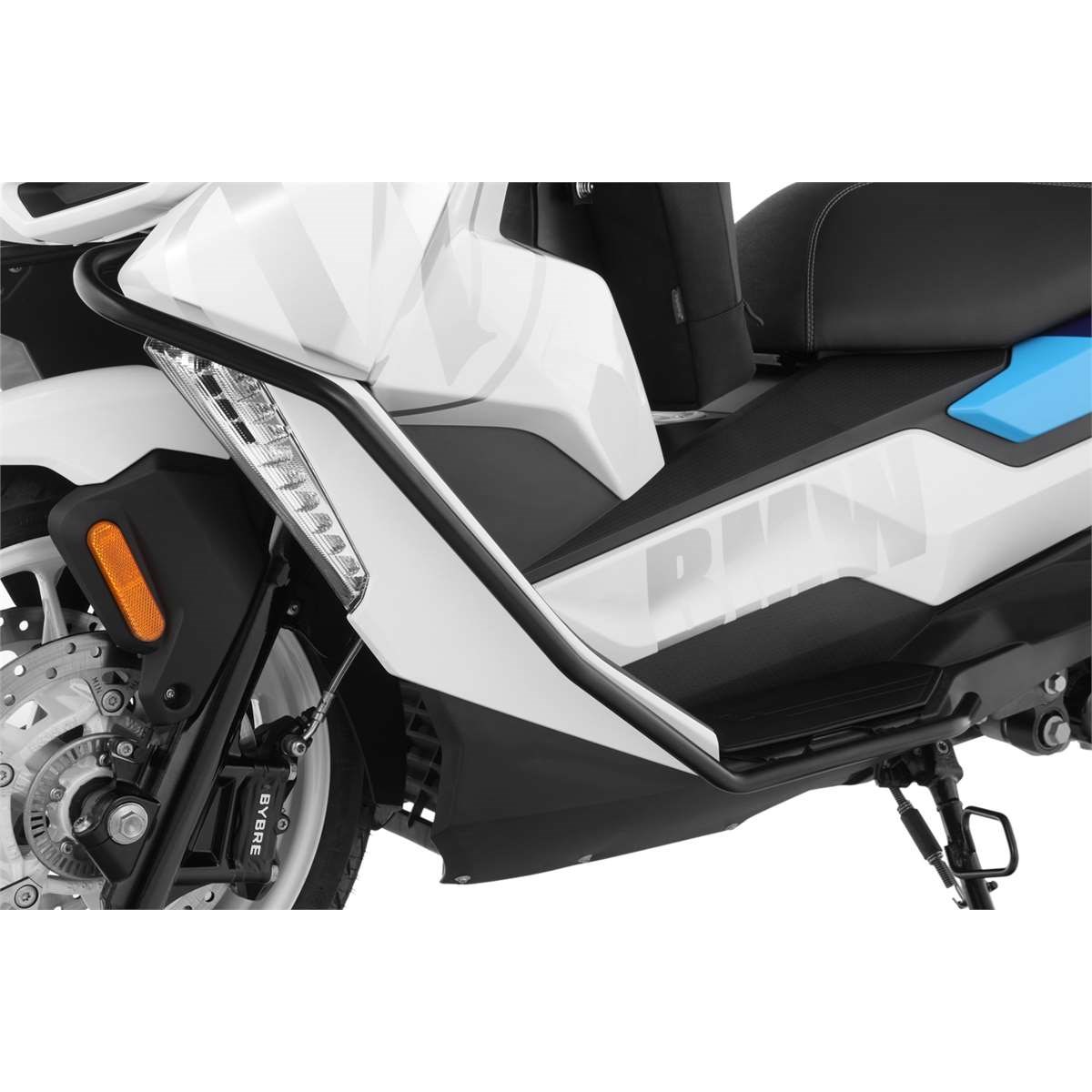 Maßgeschneiderter, perfekt integrierter und durchdachter Systemschutzbügel für den BMW Scooter C 400 GT. Dieser schwarz pulverbeschichtete Schutzbügel schützt nicht nur die Verkleidung des Scooters, wir haben ihn bis zum Trittbrett verlängert. Damit bietet er einen integralen Schutz für die neuralgischen Bereiche der Verkleidung und der exponierten unteren Fahrzeugflanke. Für den Einsatz im urbanen Umfeld, bei dem es auf den Abstellflächen für Zweiräder erfahrungsgemäß rau zugeht, haben wir die Rohrstruktur unterhalb des Scheinwerfers über die vordere Verkleidung hinausgeführt, das bietet zusätzlichen Schutz. Bei der Formgebung haben wir uns selbstverständlich an den Linien der GT orientiert, so dass sich der Schutzbügel dezent ins Designlayout des Scooters einfügt. Wir haben besonderen Wert darauf gelegt, dass die Bodenfreiheit -beispielsweise beim Überrollen von Bordsteinen- nicht beeinträchtigt wird. Dazu verwenden wir unser bewährtes 18 mm Präzisionsstahlrohr. Die Befestigung des Systemschutzbügels erfolgt smart, also ohne dass Veränderungen der Verkleidung z.B. durch Bohren notwendig sind. Die Montage ist unkompliziert: Das zweiteilige System wird mit einer soliden Zweipunktbefestigung rechts und links solide verschraubt. Damit ist sichergestellt, dass einwirkende Kräfte gleichmäßig verteilt in die geeigneten Punkte der tragenden Struktur eingeleitet werden und Schlimmeres verhindert wird.