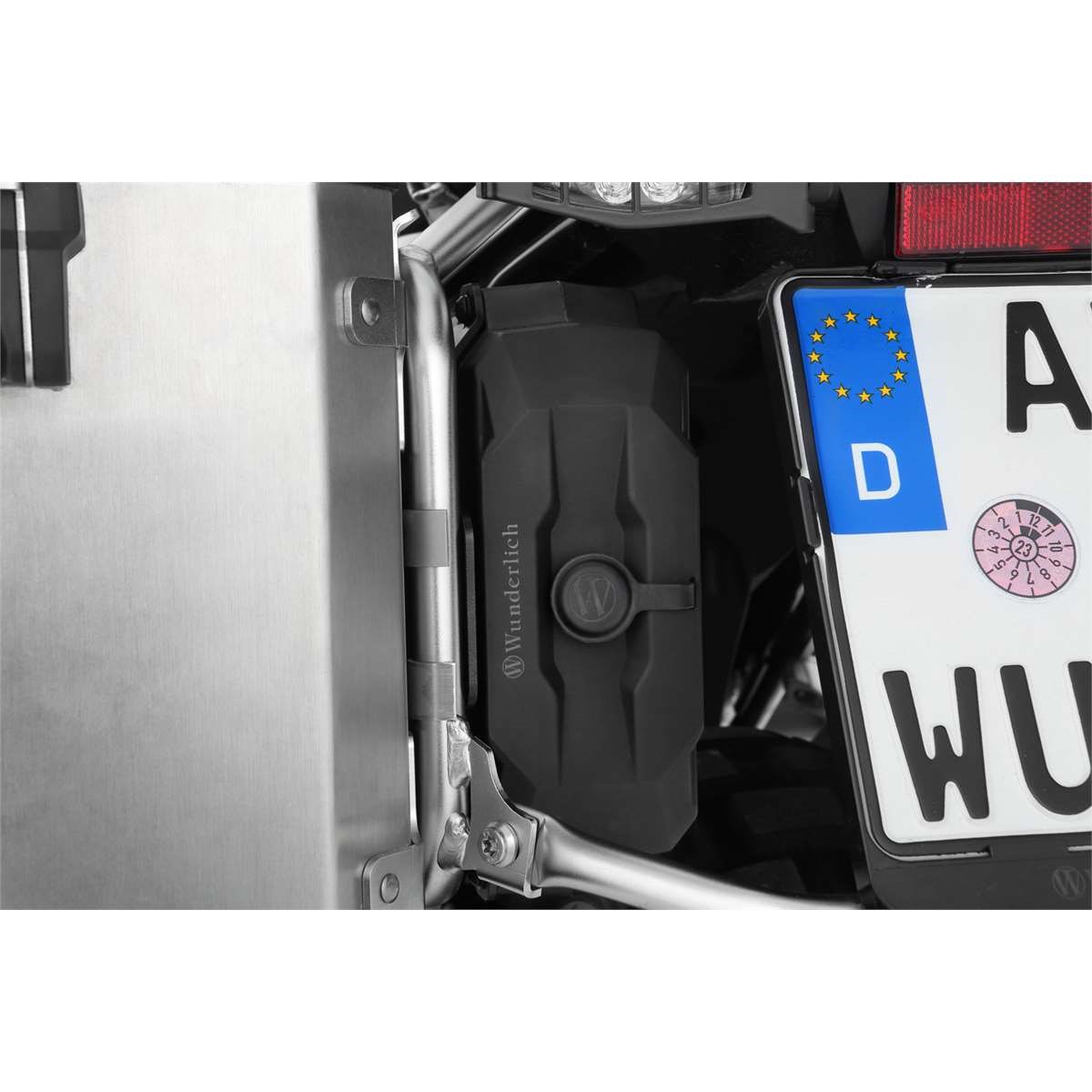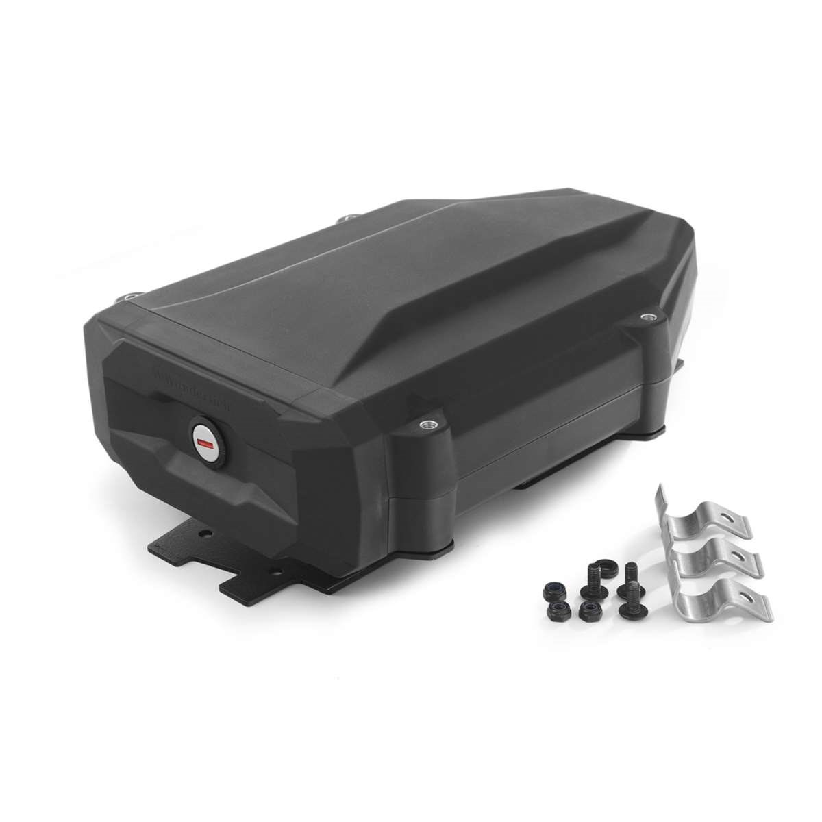 Unsere maßgeschneiderte Werkzeugbox bietet zusätzlichen Stauraum für allerlei hilfreiche Kleinigkeiten und integriert sich dafür perfekt in die Nische zwischen dem linken Kofferträger und dem Hinterrad. Die funktionale, robuste Box ist mit vier soliden Gewindeeinsätzen versehen und wird mit einem Halter und passenden Schellen am serienmäßigen Kofferträger sicher montiert. Für die jederzeit gute Zugänglichkeit lässt sie sich vom Heck her -auch bei montierten Koffern- öffnen und schließen. Der Deckel ist gegen Verlust gesichert. Die aus hochwertigem Kunststoff bestehende Box ist wasserdicht und extrem robust. Wir liefern sie mit dem Halter.