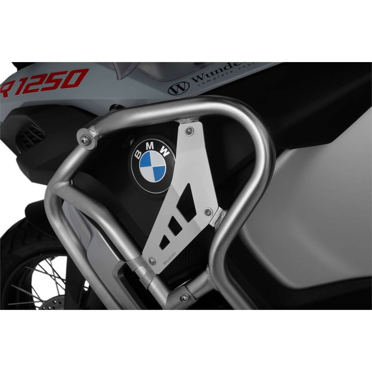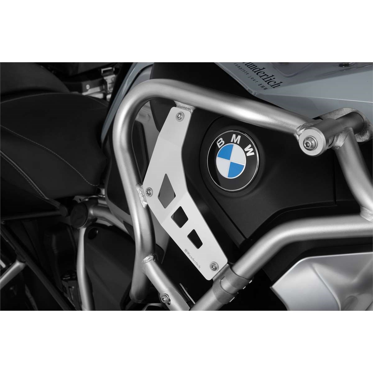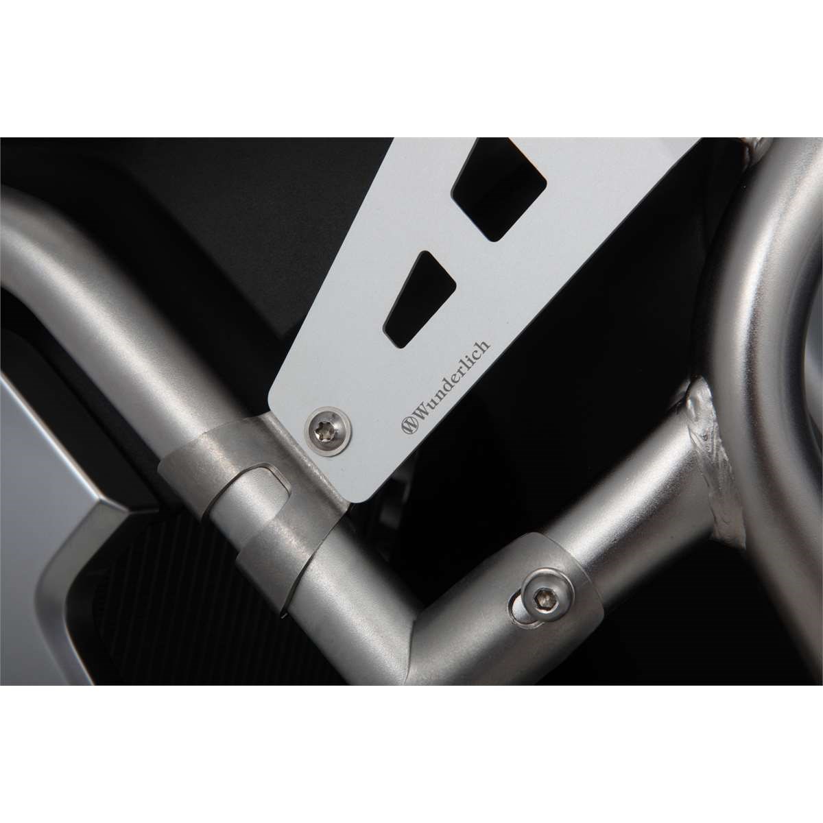Das Aluminiumblech spannt sich triangelförmig in der Fläche zwischen unserer Tankschutzbügelerweiterung 41873-200 und dem Original Adventure-Tankschutzbügel, wobei das BMW- Markenemblem am Tank nicht verdeckt wird. Es unterstreicht mit seiner technischen Ästhetik die Schutzbügelstruktur und sorgt ganz nebenbei für ein Plus an struktureller Stabilität.