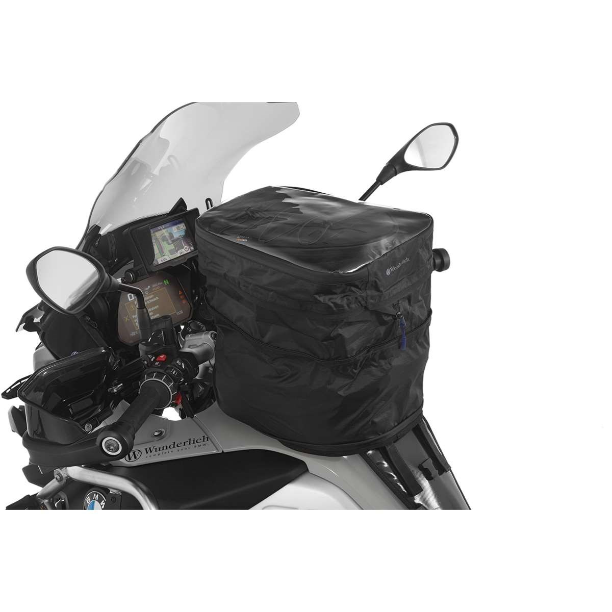 Der Zugang zum Tankrucksack ist von oben ohne Abnehmen der Regenhaube mit Hilfe eines umlaufenden Reißverschlusses möglich. Das Sichtfenster kann nach dem Öffnen einfach aufgeklappt werden