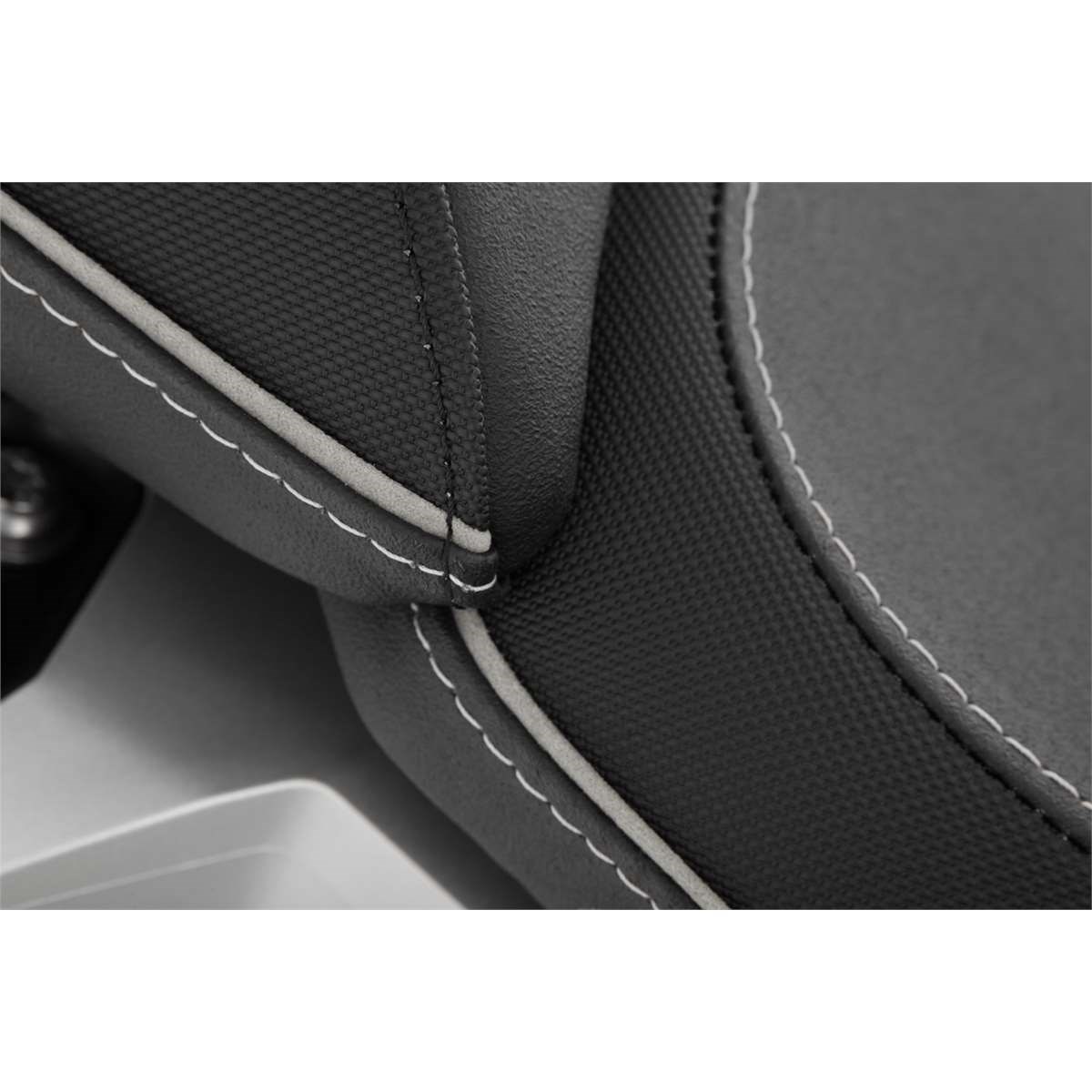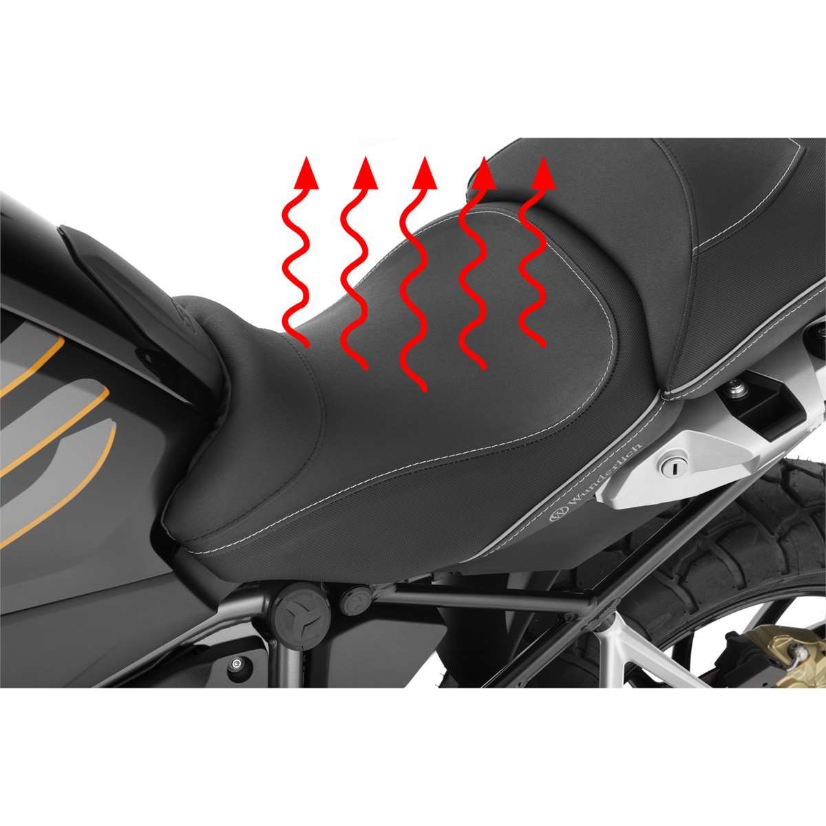Auch unsere in der Sitzhöhe reduzierten Sitze fertigen wir mit einer charakteristischen, ergonomischen 3-D-Kontur, die den Fahrer mit seinem BMW-Motorrad eins werden lässt. Form und Neigung des aufwändig verarbeiteten, progressiv aufgebauten, zweischichtigen Sitzbankkerns, in den ein Sitzheizungselement aus Carbon integriert ist, unterstützen die ergonomische vorteilhafte, natürliche Haltung des Beckens. So integriert, fährt es sich einfach entspannt und damit aktiv. Und, kein Zweifel, entspanntes Sitzen schafft ein Plus an passiver Sicherheit. Mit der ThermoPro Beschichtung liegt die Temperatur dieser Sitzbank im Hochsommer in praller Sonne um bis zu 25°C niedriger im Vergleich mit herkömmlichem, unbehandeltem Bezugsmaterial. Passend dazu haben wir eine Beifahrersitzbank im Programm.