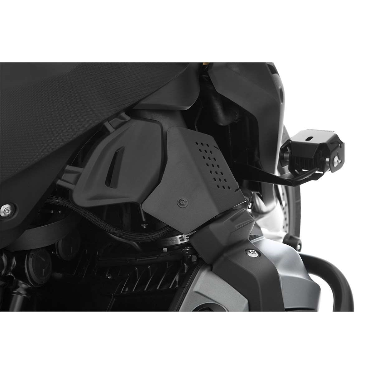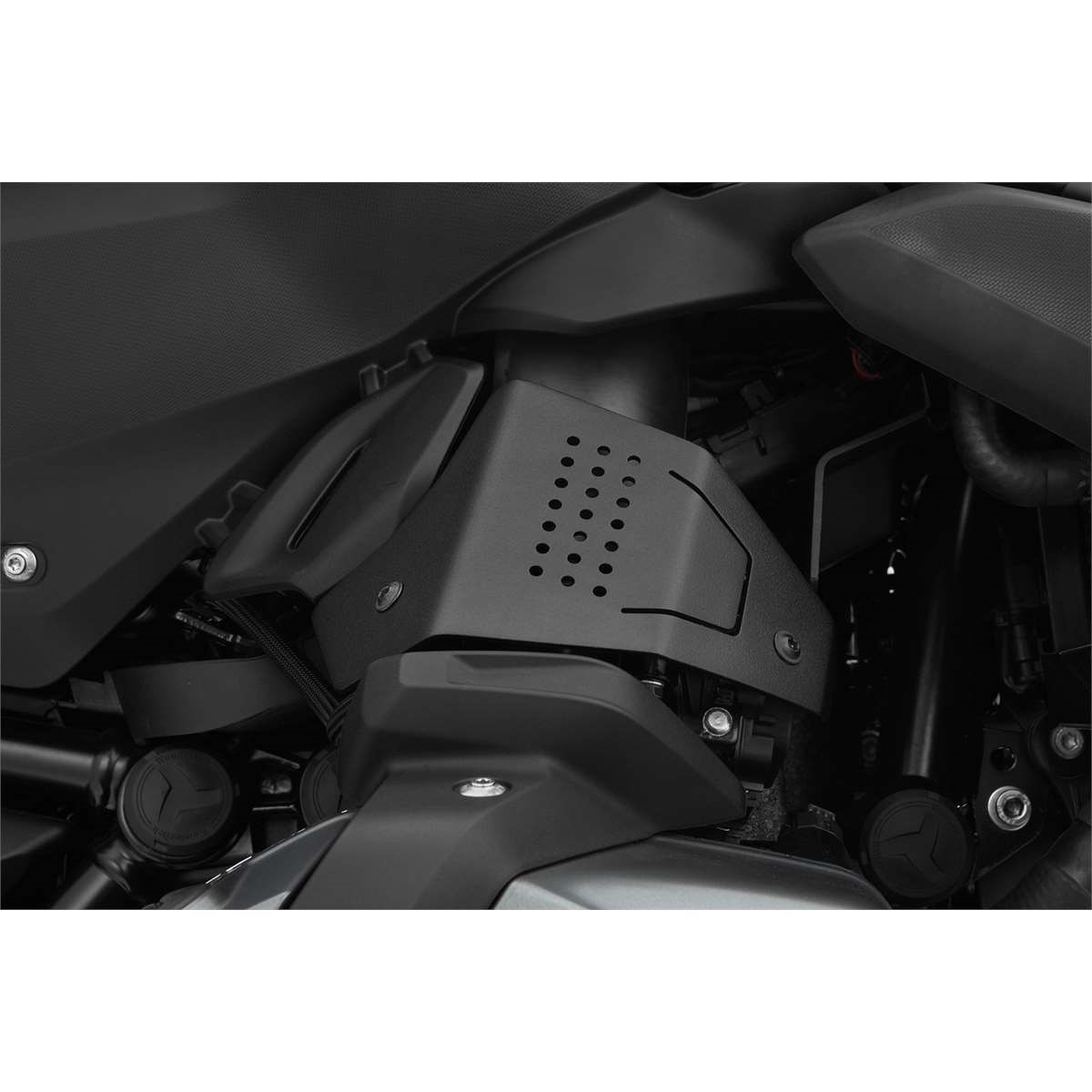 Die Abdeckung der Einspritzanlage schützt den Ansaugrohrbereich samt Einspritzrohr, Leitungsanschlüssen und den Drosselklappensensor. Immer wieder kommt es zu Undichtigkeiten an den Steckverbindungen. Diese sind auf das unglückliche Hängenbleiben mit den Stiefeln oder der Hose zurückzuführen und können leidige Fehlfunktionen zur Folge haben. Unsere Abdeckung aus pulverbeschichtetem Aluminium schützt die Komponenten der Einspritzanlage effektiv – auch gegen Manipulation der Anlage und der Steckverbinder. Optisch integriert sich die hochwertige Abdeckung für die Einspritzanlage dezent ins Design der Maschine.