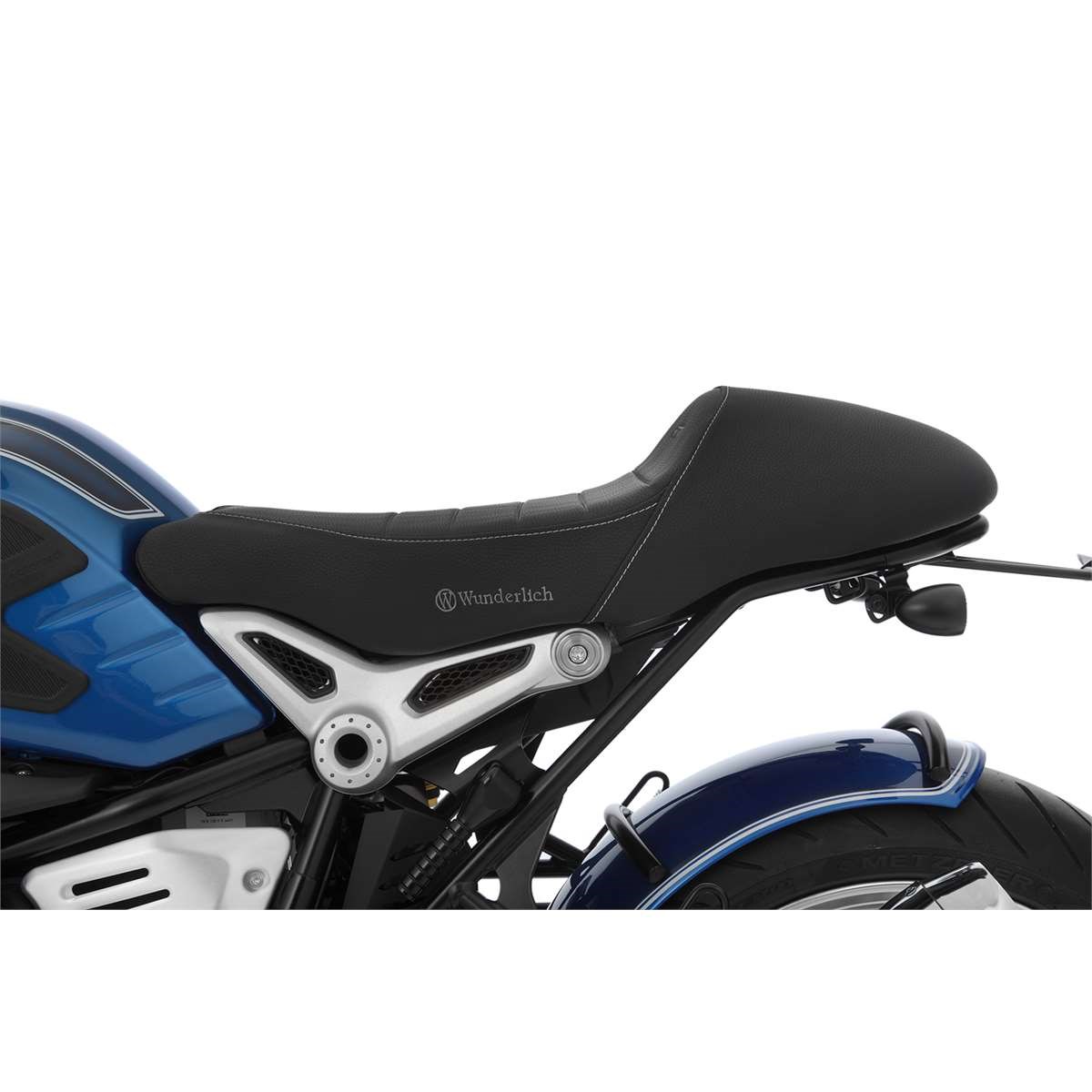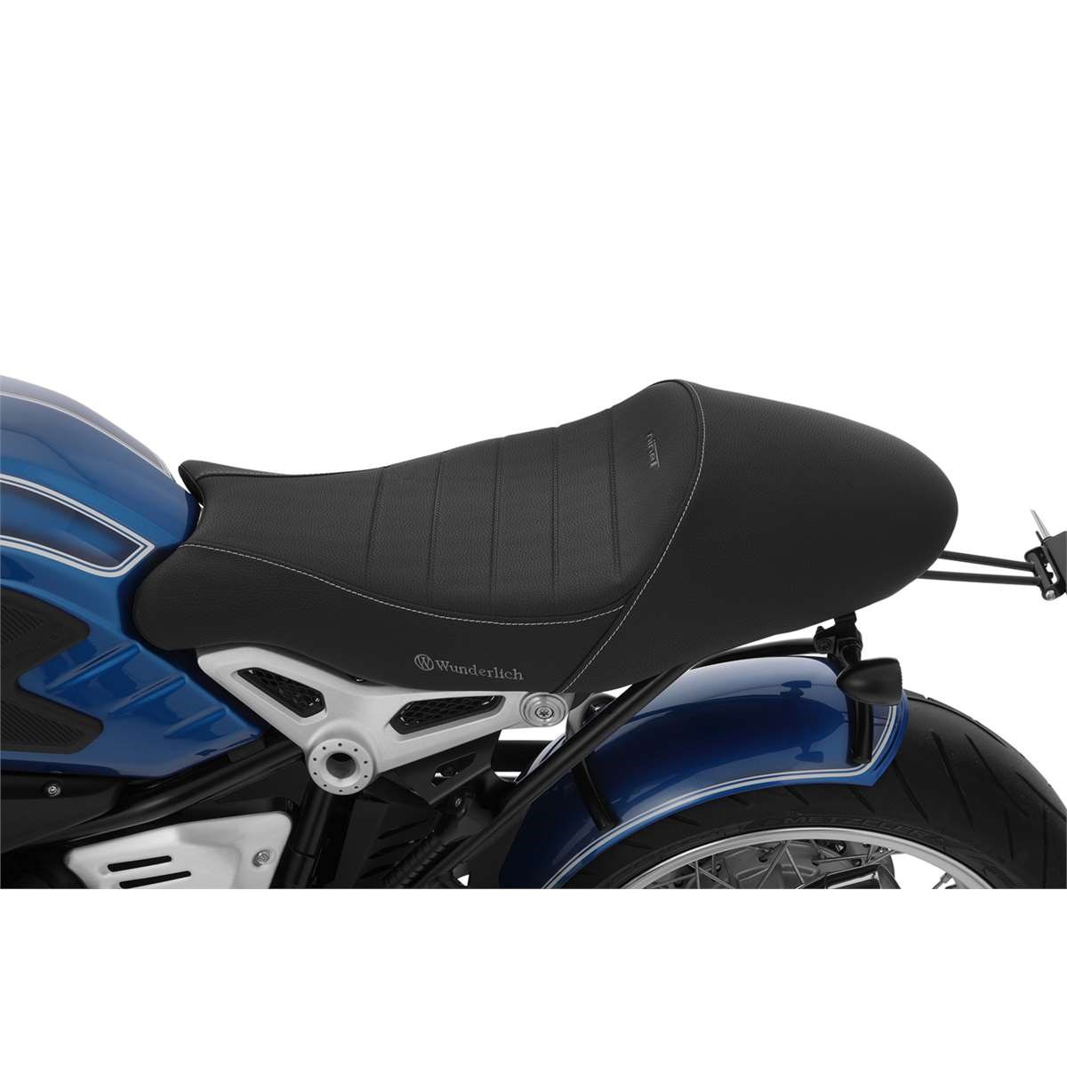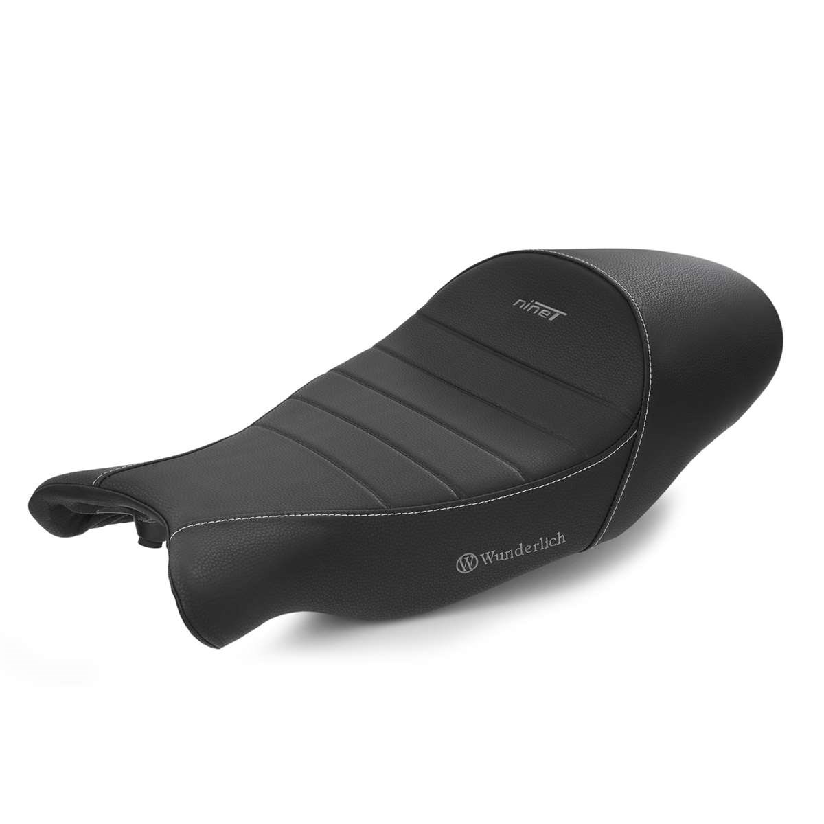 Der um 20 mm höhere Zuschnitt des Sitzpolsters eliminiert ein Manko der R nineT: Er sorgt für einen spürbar entspannteren Kniewinkel. Bestickt mit dem Wunderlich Logo sowie dem Schriftzug „nineT“.