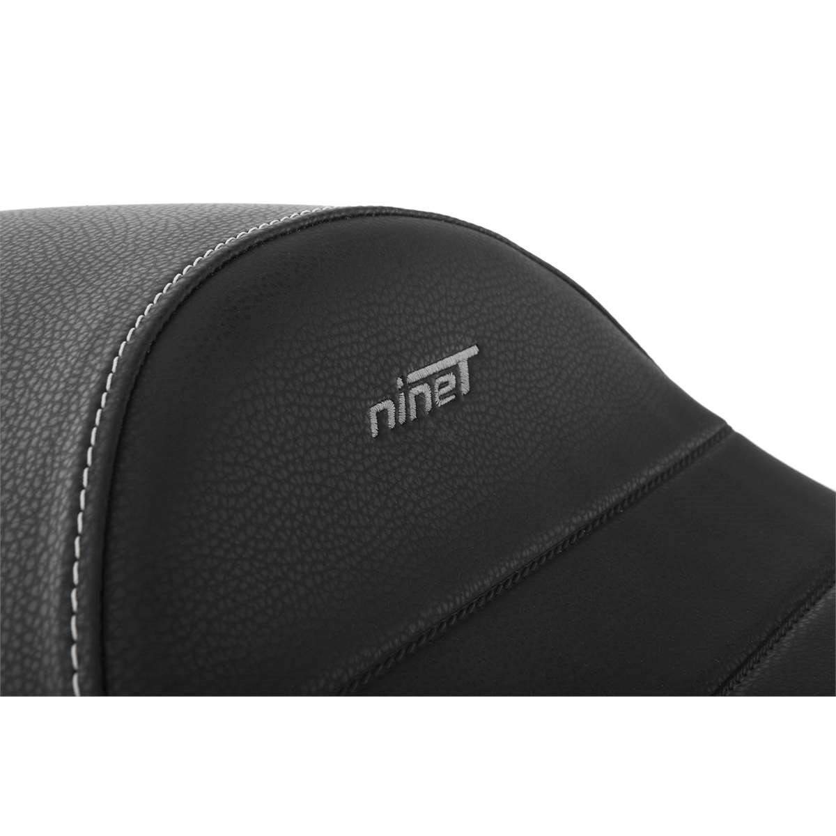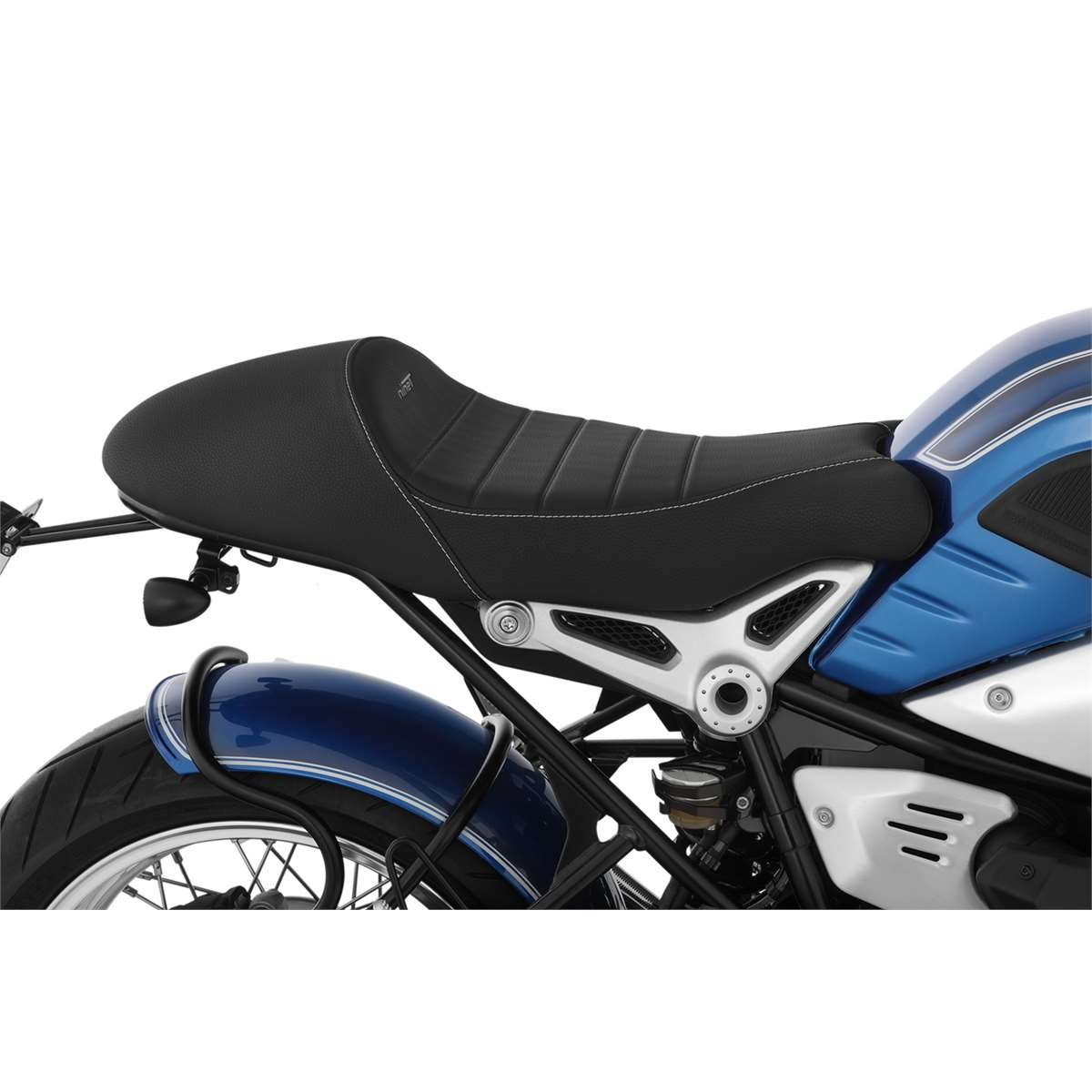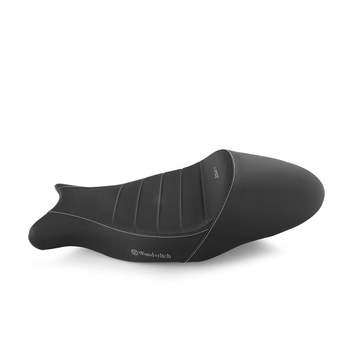 Der um 20 mm höhere Zuschnitt des Sitzpolsters eliminiert ein Manko der R nineT: Er sorgt für einen spürbar entspannteren Kniewinkel. Bestickt mit dem Wunderlich Logo sowie dem Schriftzug „nineT“.