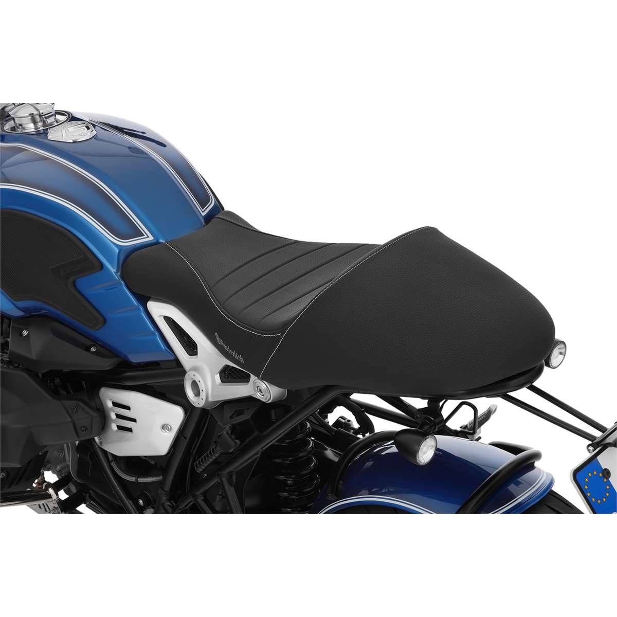 Diese sportliche Sitzbank folgt mit ihrem unteren Abschluss der Linie des Rahmens der R nineT. Die obere Linie ist ausgewogen und stilsicher geformt, der Höcker ergonomisch angelegt, so dass er beim sportlichen Einsatz optimalen Halt bietet, selbst beim Hang-off. Der Bezug ist griffig und rutschfest. Damit wird die Sitzbank zum integralen Bestandteil der R nineT. Die Grundschale besteht aus hochfestem ABS-Kunststoff und ist in unserer Entwicklungsabteilung entstanden. Dabei standen neben hochwertigen Werkstoffen und sorgfältiger, handwerklicher Verarbeitung ergonomische Faktoren im Fokus. Dies gilt ebenso für den progressiven Zweischichtaufbau des Schaumstoffes, mit weicher Oberschicht und straffem Kern. Das sorgt für eine gleichmäßige Gewichtsverteilung, Entlastung des Steißbeins und Langstreckentauglichkeit.
