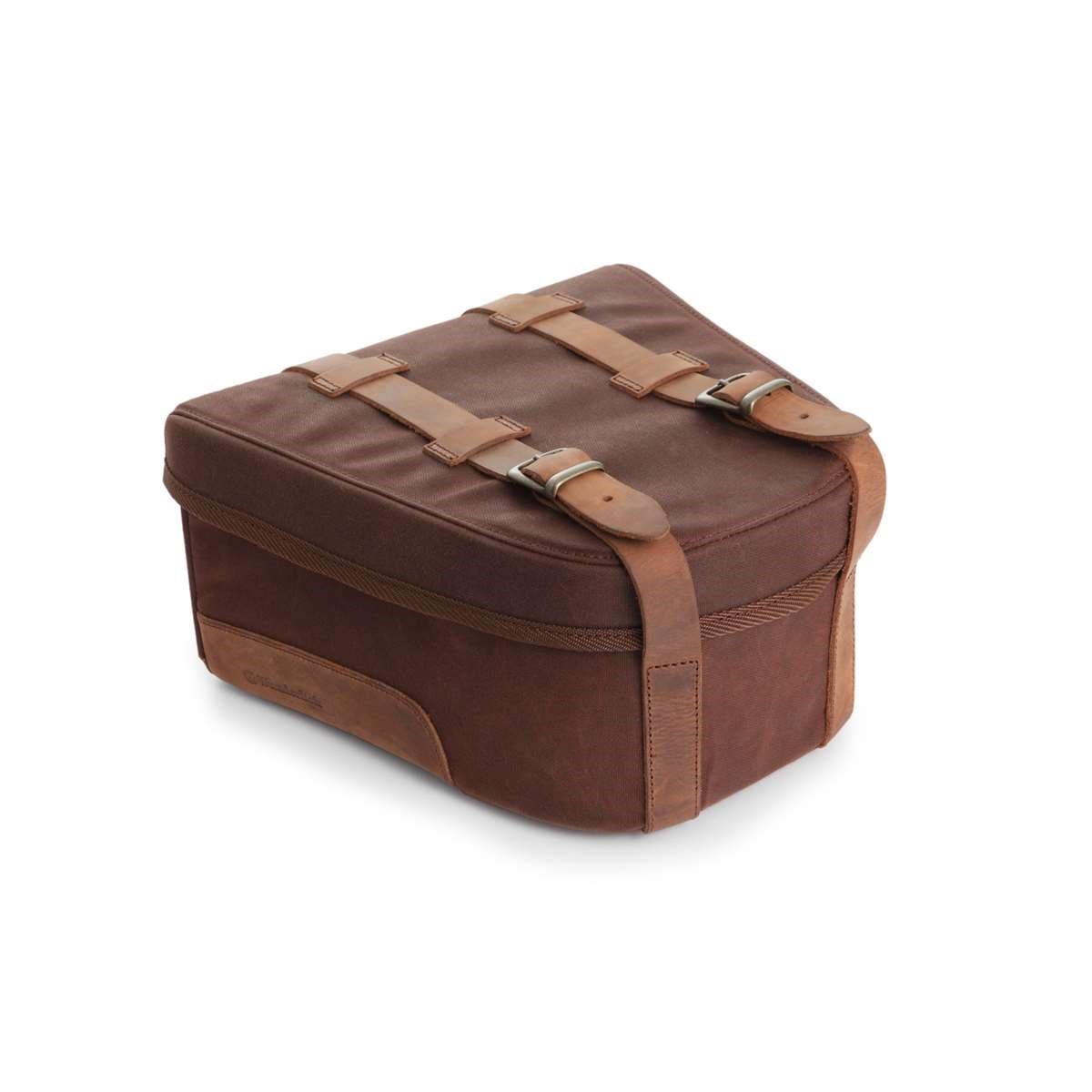 Stylische Hecktasche aus gewachster Baumwolle, speziell für die Befestigung an unserem Sozius-Gepäckträger »Rallye«. Eine praktische und bildschöne Gepäcklösung, die der BMW auch einen ansprechenden, lässigen Look verleiht .