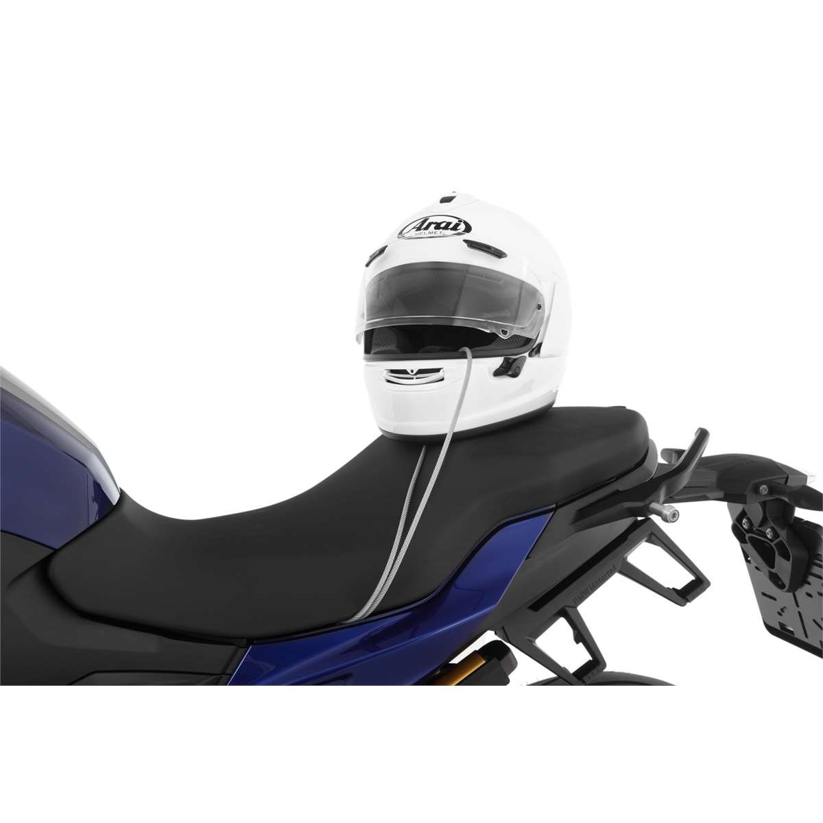 Die wohl sicherste und einfach zu handhabende Helm-Sicherung. Die robuste Basis unserer Helm Diebstahlsicherung aus Aluminium wird unter der Sitzbank sicher befestigt. Die Länge des Seils ist so bemessen, dass bis zu zwei Helme gesichert werden können. Das Drahtseil hat einen Durchmesser von 4 mm. Die solide ausgelegten Kauschen der Seilenden werden in die Einhängevorrichtung der Haltebasis eingehängt und durch einen federunterstützten Riegel sicher fixiert. Er wird zusätzlich von der montierten und abgeschlossenen Sitzbank gesichert. Damit ist es unmöglich, die Schlaufen ohne das Anheben der Sitzbank, zu öffnen. Dieses Sicherungsmerkmal finden Sie nur bei uns. Ein weiterer Vorteil ist, dass kein weiteres Schloss erforderlich ist und man keinen weiteren Schlüssel mit sich führen muss. Die transparente, großzügig dimensionierte Ummantelung des Sicherungsseils aus Silikon schont Helme wie Motorrad vor Scheuerstellen und Lackschäden. Das Seil wird bei Nichtgebrauch -stets griffbereit- platzsparend unter der Sitzbank verstaut. Unsere »HELM-LOCK« Diebstahlsicherung ist einfach in der Anwendung und enorm hilfreich, so dass Sie diese nicht mehr missen möchten.