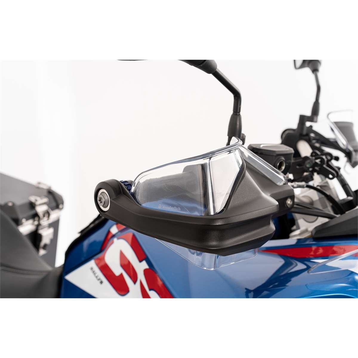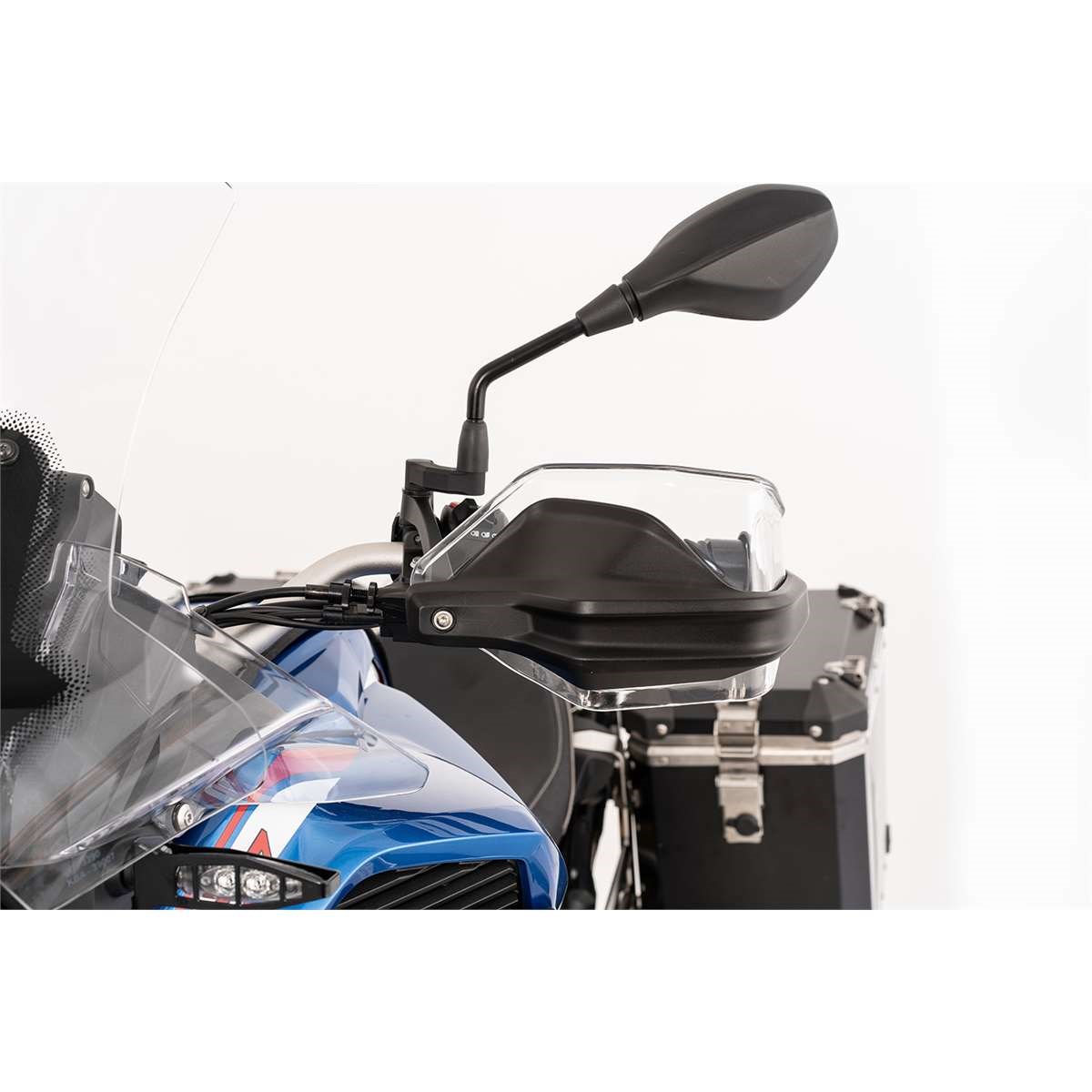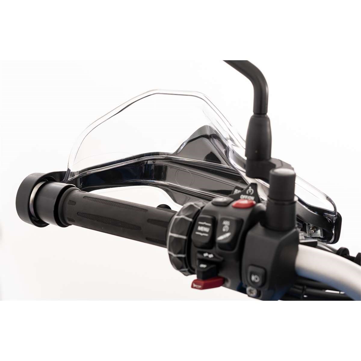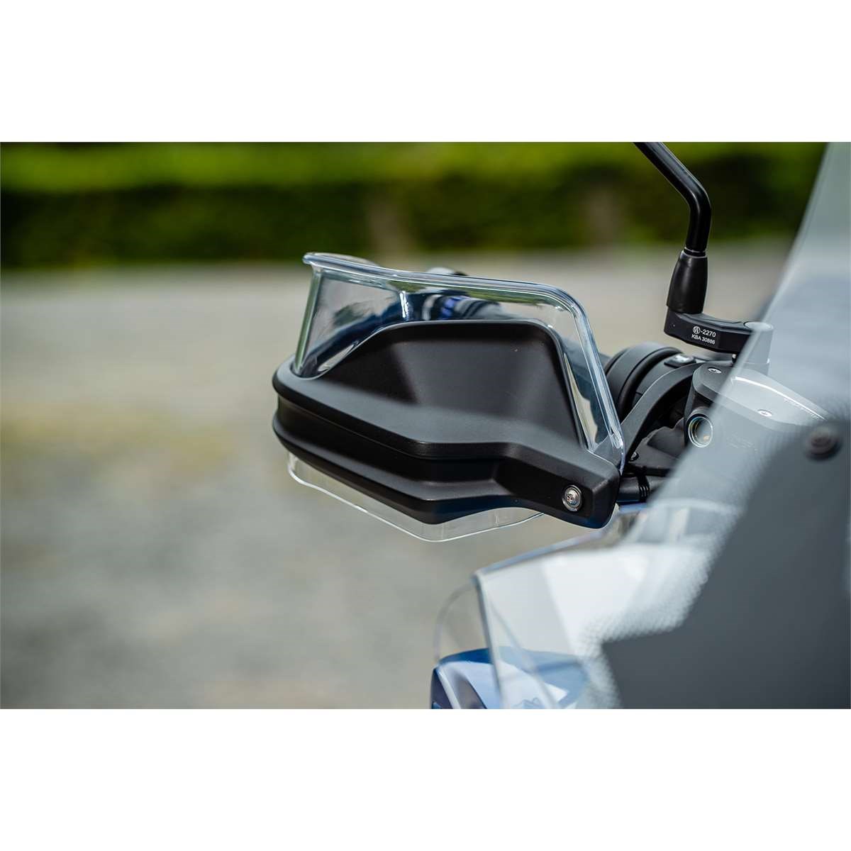 Kalte, klamme oder nasse Hände sind unangenehm, genau wie Steinschlag, Straßenschmutz jeder Art oder bei hohen Geschwindigkeiten aufprallende Insekten. Mit unserer Handprotektoren Verbreiterung vergrößern wir den Schutzbereich der Original Protektoren ganz erheblich: In der Höhe, in der Breite und wir führen ihn auch noch seitlich um die Hand herum bis zum Lenkerende. Mehr Schutz geht nicht, aber so viel Schutz sollte schon sein. Mit diesen Maßnahmen verbessern wir die Schutzeffizienz ganz entscheidend. Die Oberkante haben wir zur Wasserableitung mit einem nach außen ragenden Kragen versehen, der Spritzwasser nach außen lenkt und seitlich abfließen lässt. Die transparente Ausführung ist funktional und ansprechend.