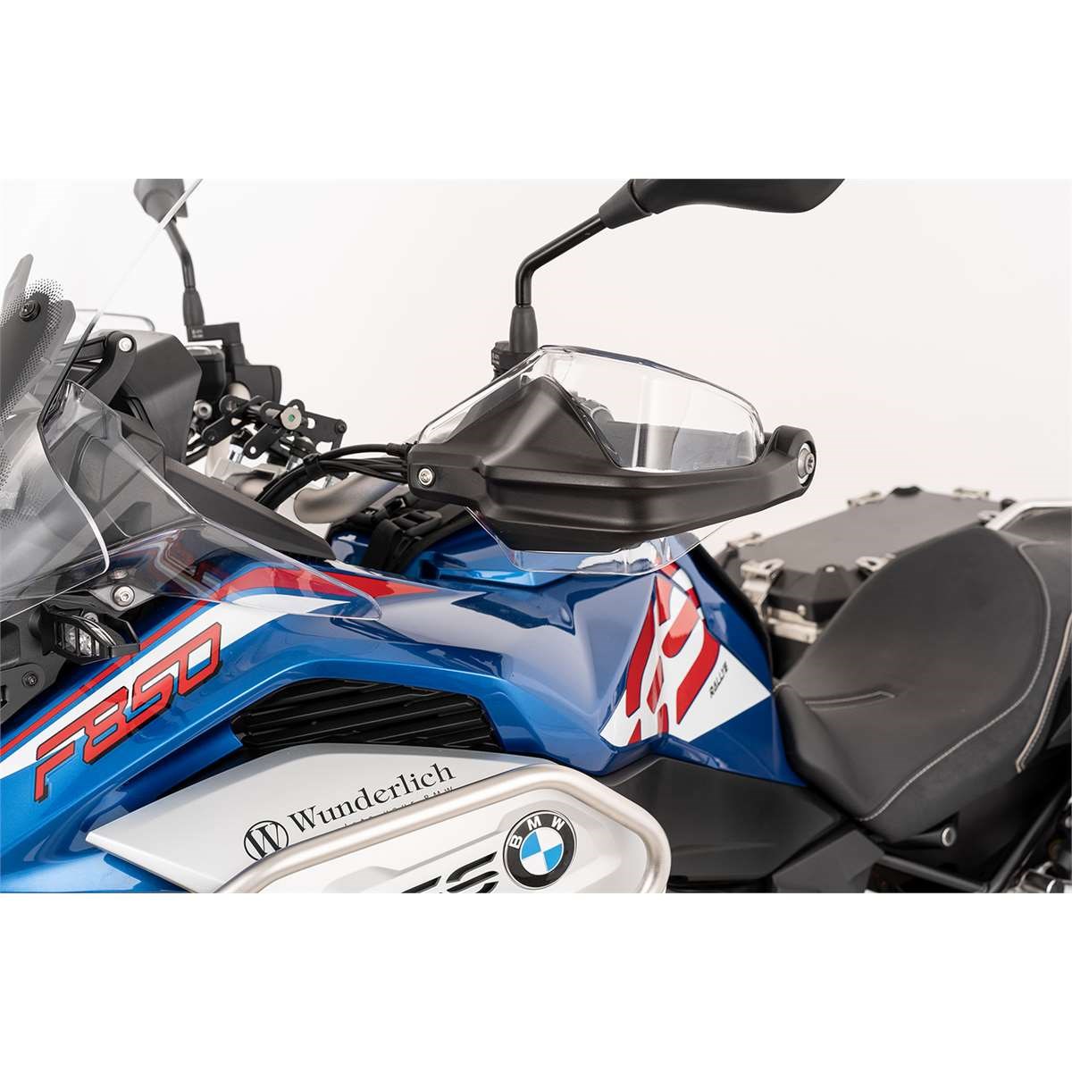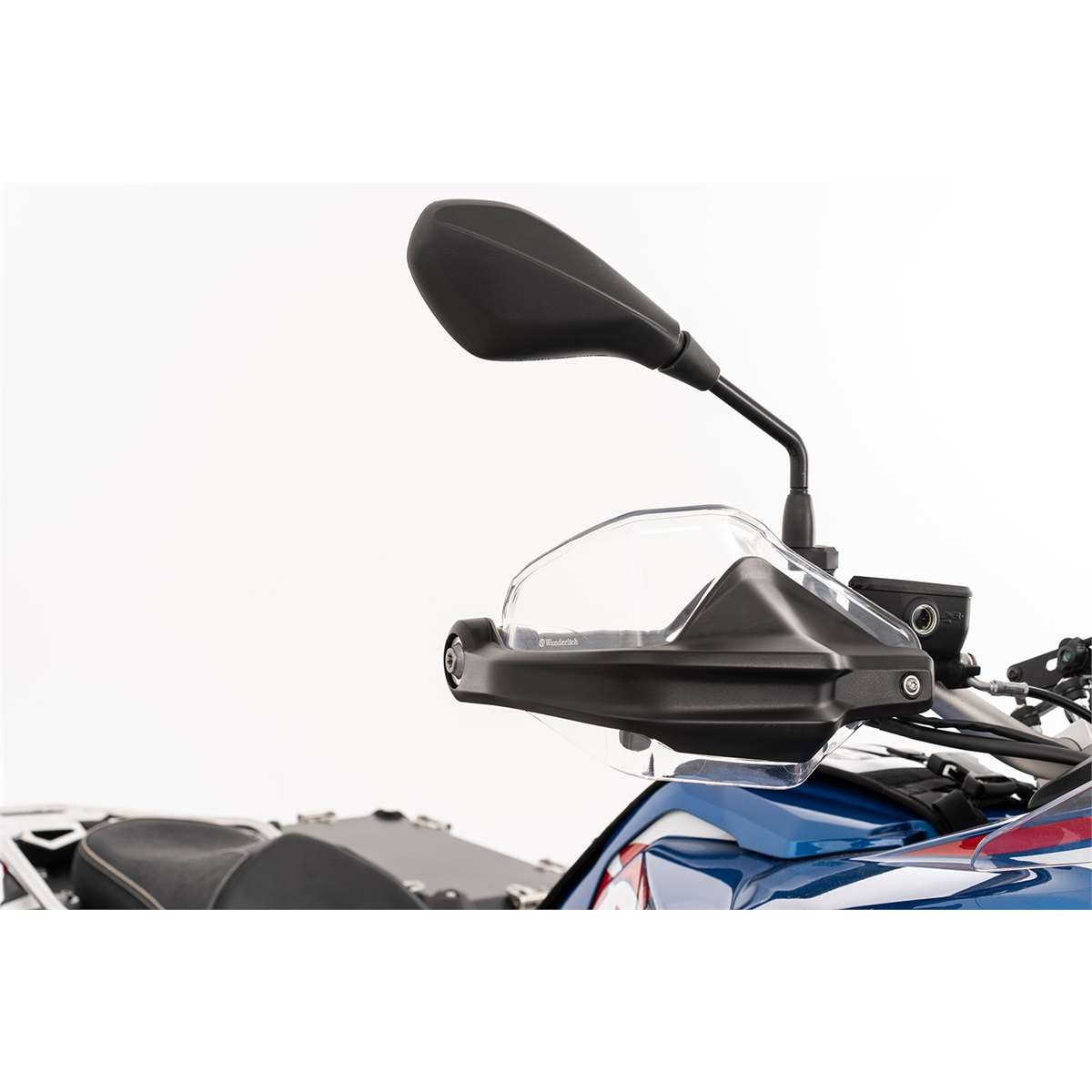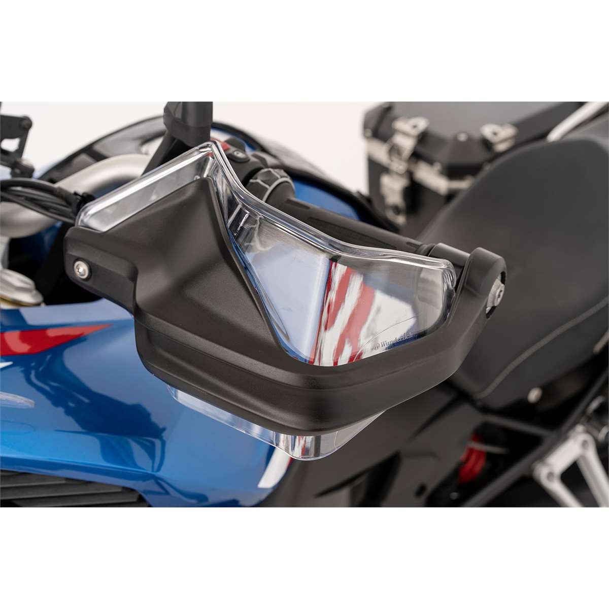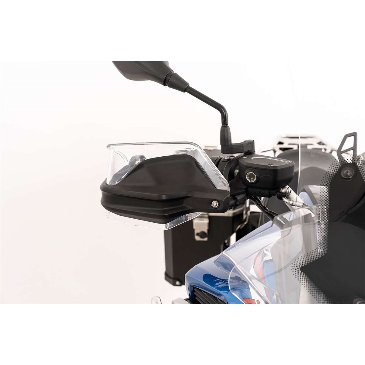 Kalte, klamme oder nasse Hände sind unangenehm, genau wie Steinschlag, Straßenschmutz jeder Art oder bei hohen Geschwindigkeiten aufprallende Insekten. Mit unserer Handprotektoren Verbreiterung vergrößern wir den Schutzbereich der Original Protektoren ganz erheblich: In der Höhe, in der Breite und wir führen ihn auch noch seitlich um die Hand herum bis zum Lenkerende. Mehr Schutz geht nicht, aber so viel Schutz sollte schon sein. Mit diesen Maßnahmen verbessern wir die Schutzeffizienz ganz entscheidend. Die Oberkante haben wir zur Wasserableitung mit einem nach außen ragenden Kragen versehen, der Spritzwasser nach außen lenkt und seitlich abfließen lässt. Die transparente Ausführung ist funktional und ansprechend.