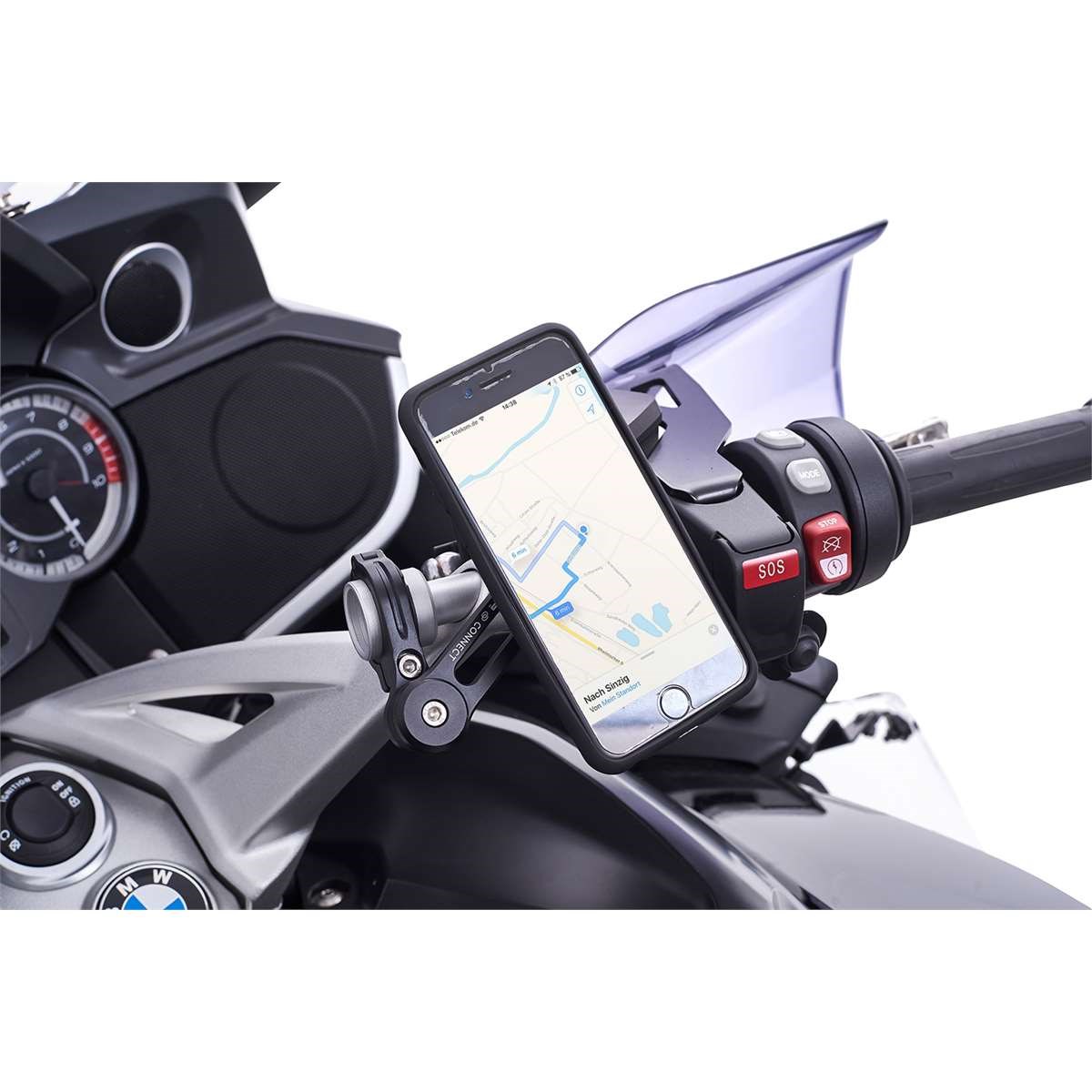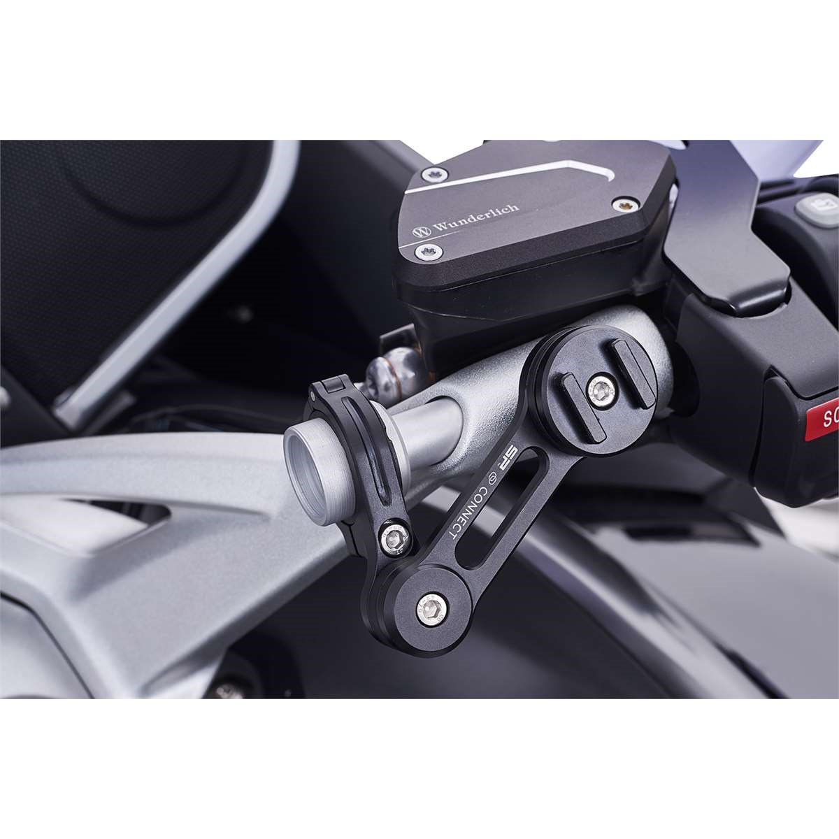 Dieser Adapter verlängert die Lenkeraufnahme zur Mitte der Gabelbrücke hin, wodurch an dieser Verlängerung eine normale Rundrohr-Halterung des SP-Connect-Systems befestigt werden kann. Damit ist das Smartphone sicher im Sichtfeld positioniert und kann zur Navigation etc. benutzt werden.