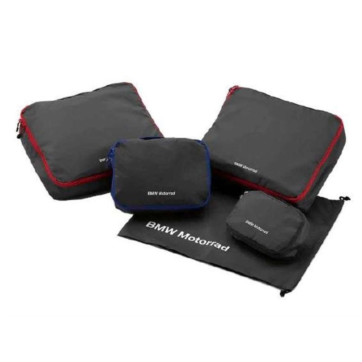 Das praktische Packbeutel-Set sorgt für Ordnung im Motorradkoffer und hilft beim Sortieren des Reisegepäcks. Es umfasst zwei Beutel in den Größen L, je einen Beutel in Größe M und S sowie einen Wäschebeutel mit Turnbeutelverschluss. Verschiedene Farben für Reißverschlüsse, Reißverschlussanhänger und Tragegriffe erleichtern die Unterscheidung. Die beiden großen Beutel eignen sich für Kleidungsstücke wie T-Shirts und Hosen. Sie besitzen einen leicht verstärkten Boden und eine große Öffnung mit einem über drei Seiten laufenden Reißverschluss für komfortables Packen. Die mittlere Größe ist ideal für Unterwäsche. In dem kleinen Beutel lassen sich eine Reiseapotheke, ein Kulturbeutel oder Kabel verstauen. Der Turnbeutel ist für Schmutzwäsche gedacht oder als Aufbewahrung für die anderen Beutel. Reißfestes Nylonmaterial mit PU-Beschichtung macht die Beutel strapazierfähig. Dennoch lassen sie sich bei Nichtgebrauch sehr klein zusammenfalten. Das Packbeutel-Set ist auf die Größe der BMW Motorradkoffer abgestimmt und passt daher perfekt.
