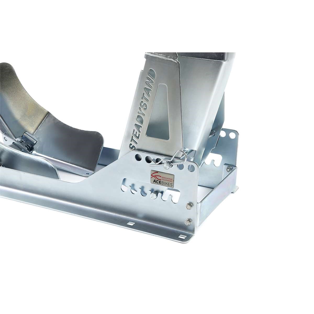 Der hochwertige, galvanisierte Acebikes SteadyStand Fixed ist die perfekte Lösung, um Ihr Bike risikolos und einfach zu transportieren. Sie können den SteadyStand Fixed bequem und schnell auf dem Boden eines herkömmlichen Anhängers oder im Inneren eines Transporters montieren. Nach der Montage des Motorrad Transportständers kann das Bike im SteadyStand Fixed Motorradhalter befestigt werden und in aufrechter Position transportiert werden. Das Eigengewicht des Motorrades stellt sicher, dass es fest verankert ist und stabil steht. Für eine komplett sichere Position müssen Sie das Zweirad lediglich noch mit Spanngurten fixieren. Die clevere Konstruktion des SteadyStand Multi Fixed macht es möglich, dass der Ständer ohne Werkzeug auf die Reifengröße Ihres Bikes eingestellt werden kann. Dieses benutzerfreundliche System arbeitet perfekt. So können Sie das Zweirad mit dem Vorder- oder mit dem Hinterreifen stabil fixieren. Der SteadyStand Fixed ist für Reifengrößen von 15 bis 21 Zoll, mit einer Reifenbreite von 90 mm bis 200 mm, geeignet.