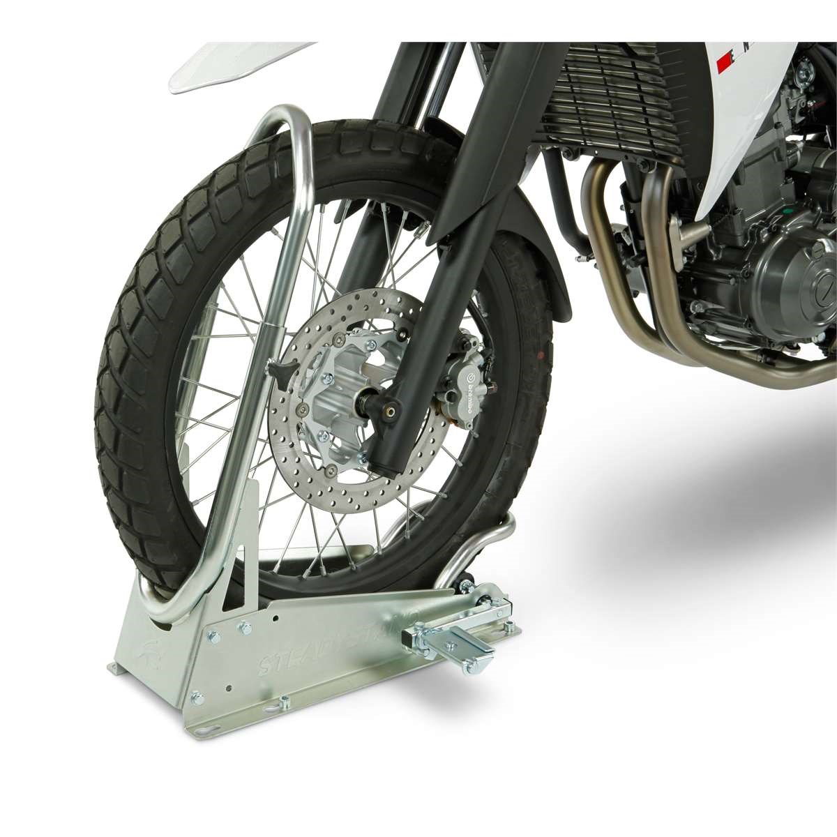 Der super praktische SteadyStand Cross ist für Offroad Bikes mit einer Bereifung von 18 bis 21 Zoll mit einer Reifenbreite von 90 bis zu 120 mm geeignet. Mit einem Fußpedal wird das Vorderrad im Ständer verankert, so ist das Herunterziehen der Gabel unnötig und Sie vermeiden Beschädigungen an den Dichtungen. SteadyStand Cross sichert das Vorderrad des Motocross Bikes, Sie müssen lediglich für die Sicherung des hinteren Endes Ihres Motorrads sorgen. Dies kann beispielsweise mit Spannguten erfolgen. Übrigens, dass Fußpedal kann auf beiden Seiten des SteadyStand Cross montiert werden, so wird die Fixierung des Dirtbikes zum Kinderspiel.