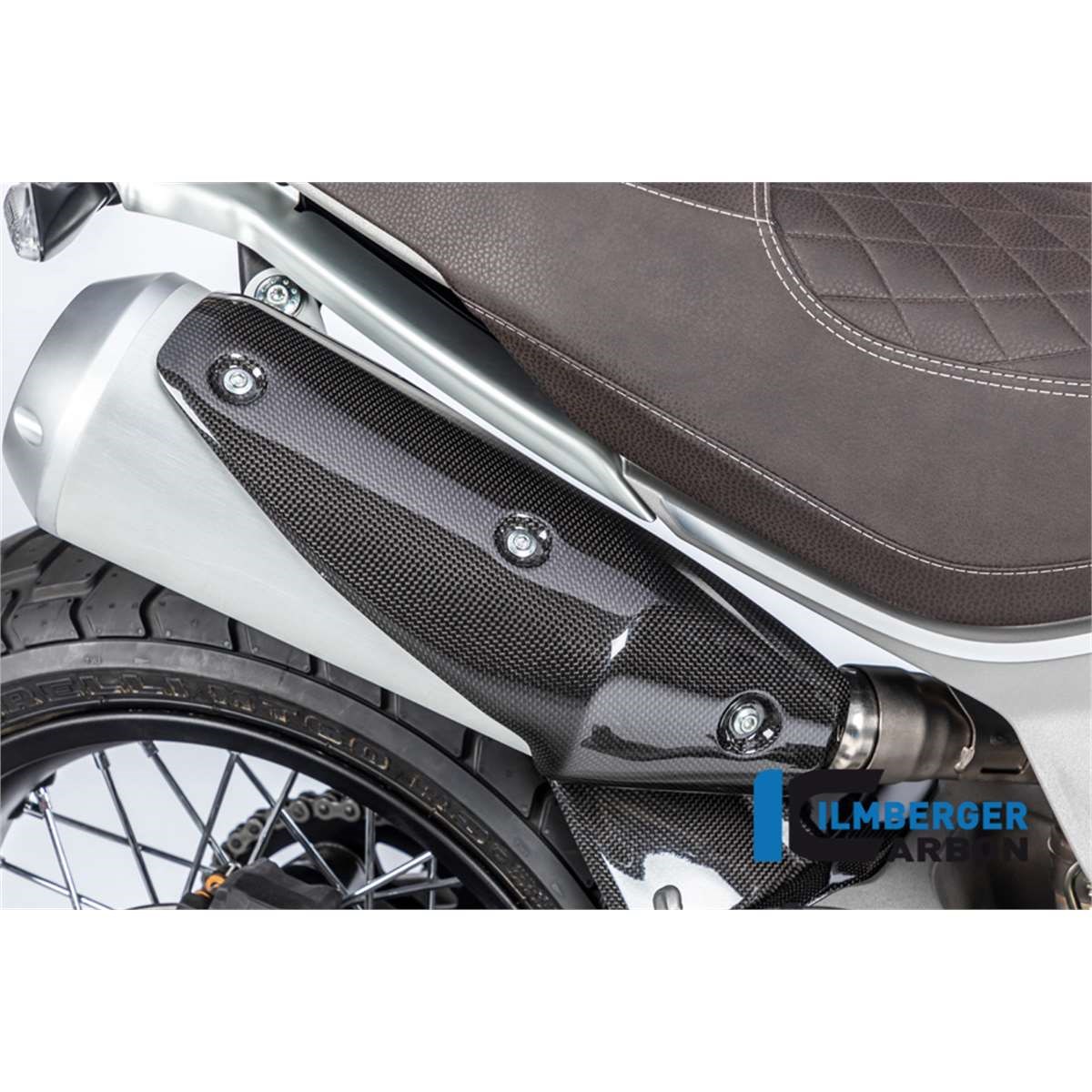 Der Auspuffhitzeschutz für die rechte Seite in Carbon und glänzender Ausführung für die Ducati Scrambler 1100 ab 2017 wird an vorhandenen Haltepunkten am Fahrzeug aufgeschraubt.